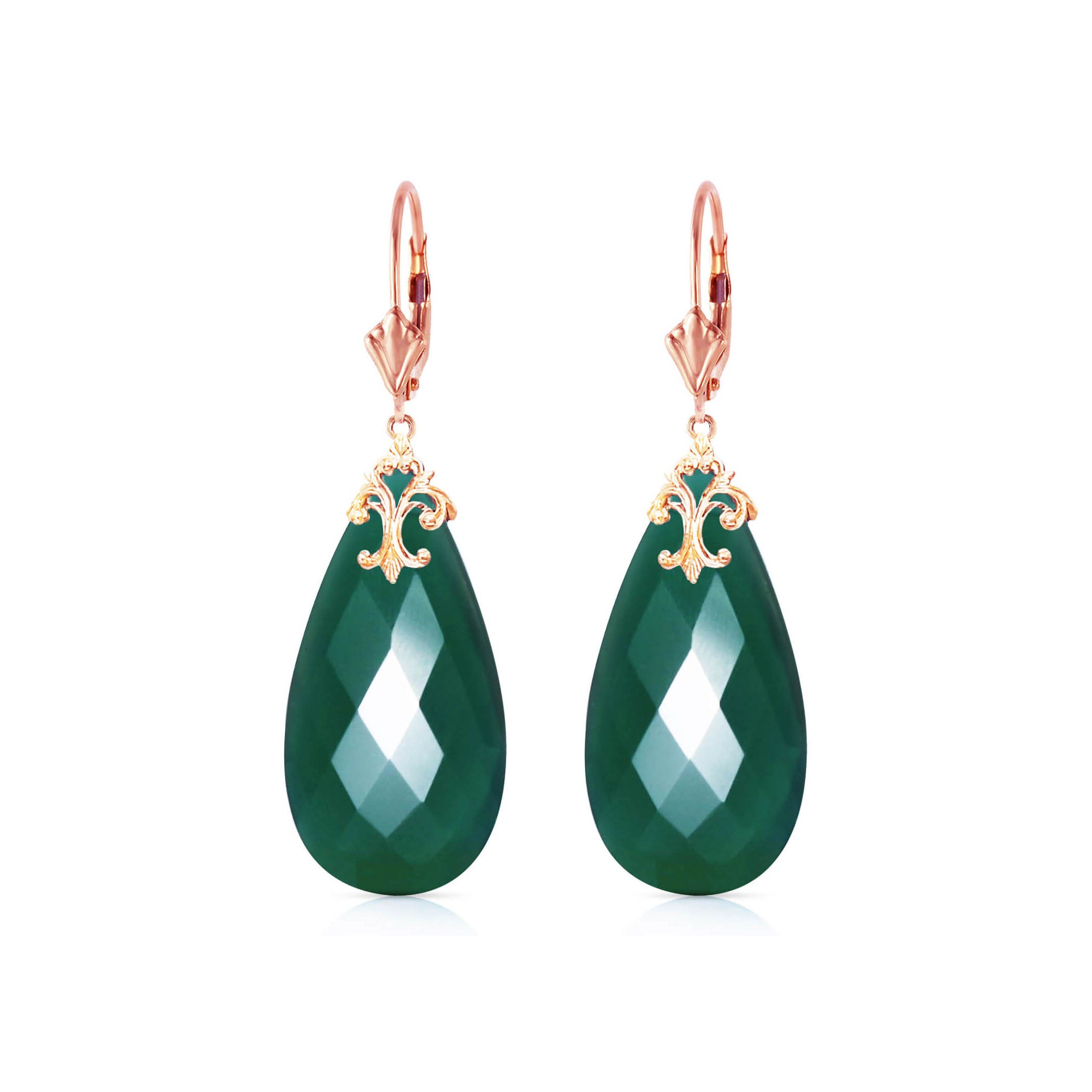 Green Chalcedony Leverback Earrings handcrafted in rose gold plated 9ct gold. Two genuine chalcedony, total 34 ct for both earrings combined. Briolette cut. Size: 10.2 x 51.3 mm (0.4 x 2.02 in). Material: 9ct Rose Gold. Total metal weight: 6.8 gr. 2 briolette cut green chalcedony (31 x 16 mm) = 34 ct total for pair. Colour: Green. Stone cut: Briolette Cut.
