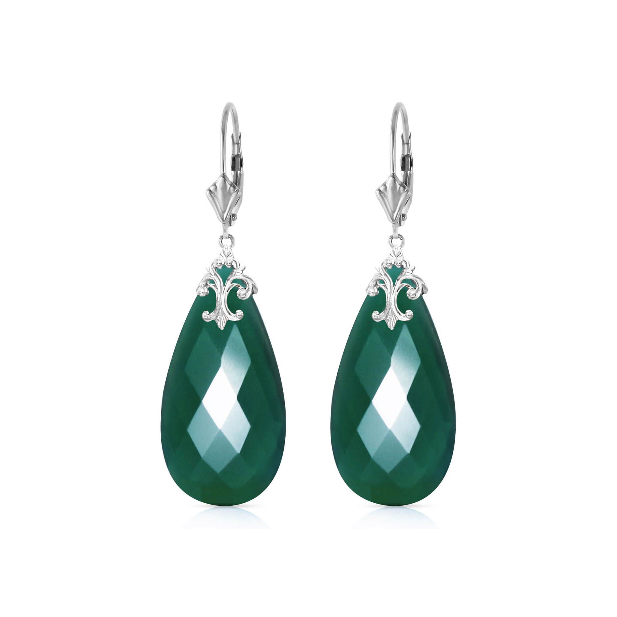 Green Chalcedony Leverback Earrings handcrafted in solid white gold. Two genuine chalcedony, total 34 ct for both earrings combined. Briolette cut. Size: 10.2 x 51.3 mm (0.4 x 2.02 in). Material: 9ct White Gold. Total metal weight: 6.8 gr. 2 briolette cut green chalcedony (31 x 16 mm) = 34 ct total for pair. Colour: Green. Stone cut: Briolette Cut.