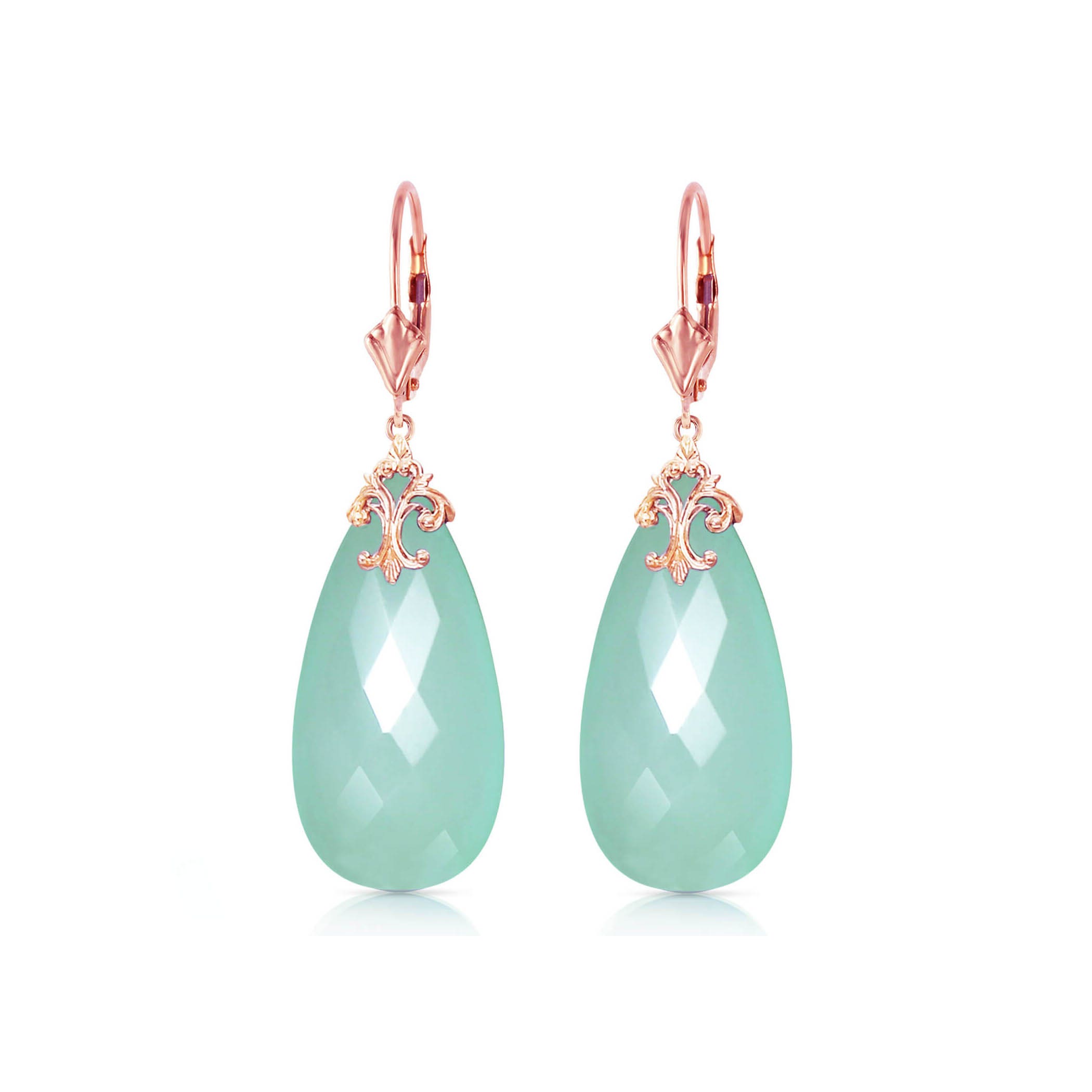 Green Chalcedony Leverback Earrings handcrafted in rose gold plated 9ct gold. Two genuine chalcedony, total 35.5 ct for both earrings combined. Briolette cut. Size: 10.2 x 51.3 mm (0.4 x 2.02 in). Material: 9ct Rose Gold. Total metal weight: 7.0 gr. 2 briolette cut green chalcedony (31 x 16 mm) = 35.5 ct total for pair. Colour: Green. Stone cut: Briolette Cut.