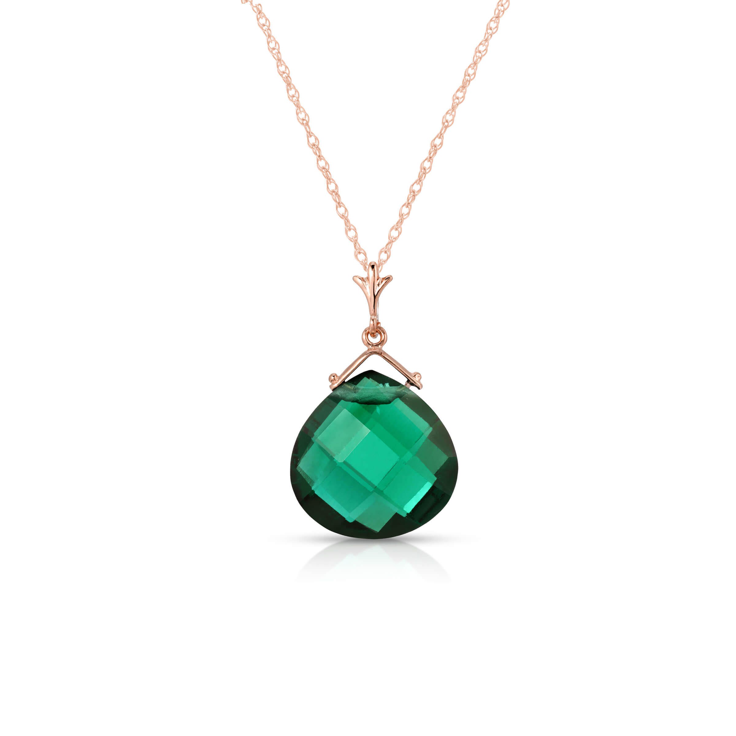 Lab Grown Emerald Pendant Necklace handcrafted in rose gold plated 9ct gold. Single 7 ct lab grown emerald. Briolette cut. The pendant hangs from a rose gold double link rope chain with spring clasp. Size: 14 x 25.4 mm (0.55 x 1 in). Material: 9ct Rose Gold. Total metal weight: 2.24 gr. 1 briolette cut lab grown emerald (14 x 14 mm) = 7 ct. Colour: Green. Stone cut: Briolette Cut. Anniversary: 20th Anniversary, 35th Anniversary. Birthstone: May.
