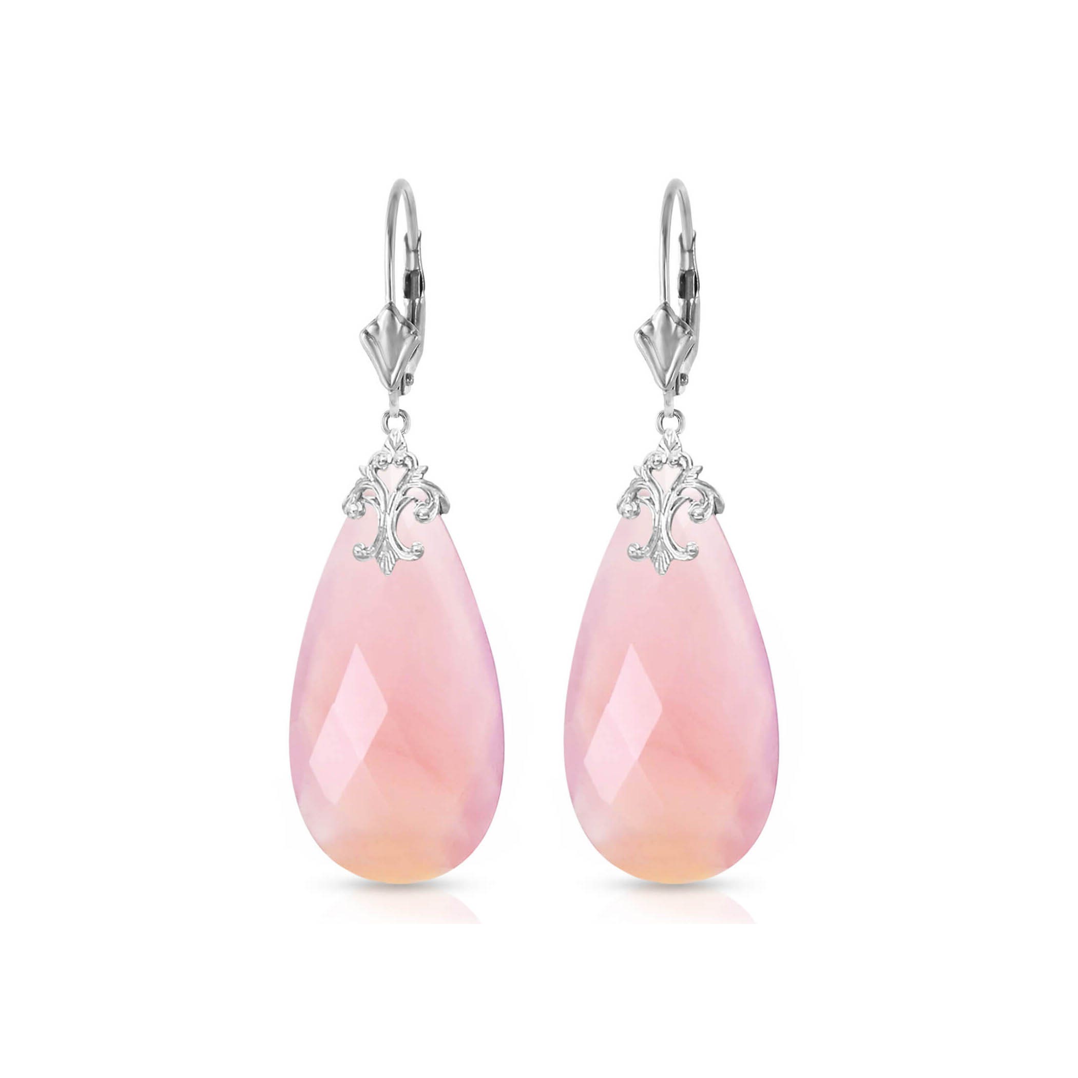 Pink Chalcedony Leverback Earrings handcrafted in solid white gold. Two genuine chalcedony, total 38 ct for both earrings combined. Briolette cut. Size: 10.2 x 51.3 mm (0.4 x 2.02 in). Material: 9ct White Gold. Total metal weight: 7.4 gr. 2 briolette cut pink chalcedony (31 x 16 mm) = 38 ct total for pair. Colour: Pink. Stone cut: Briolette Cut.