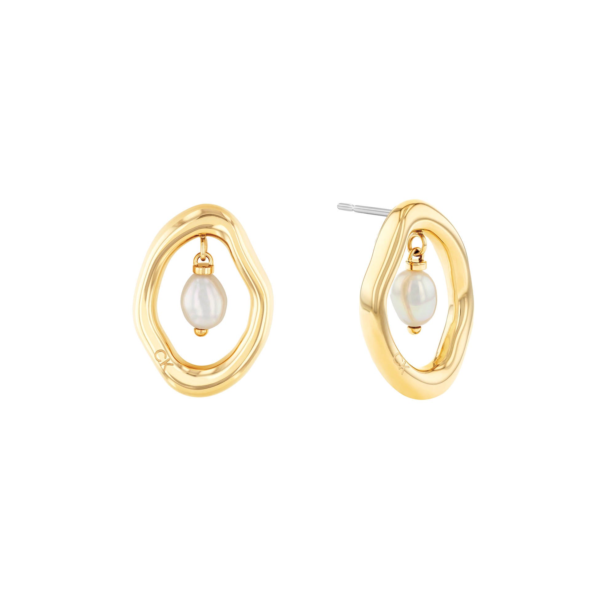 Pearl earrings like no other. The Calvin Klein Women’s Edgy Pearls Yellow Gold IP Earrings feature a pearl drop pendant hung within a geometric gold plated circular frame with subtle CK detailing. For the complete pearl look, pair these with the Calvin Klein Women’s Edgy Pearls Yellow Gold IP Necklace. Size: 19 x 13 mm (0.75 x 0.51 in). Material: Gold Plated Stainless Steel. Colour: White. Anniversary: 3rd Anniversary, 30th Anniversary. Birthstone: June.