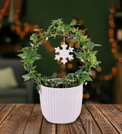 If you are looking for something unique for your home this Christmas season look no further than our Christmas Ivy hoop. Its elegant design is perfectly accompanied by stunning twinkling Christmas lights to make it an even more stand out item for any room. This Christmas Ivy comes with a lovely white pot providing a neutral contrast to any room in your home.