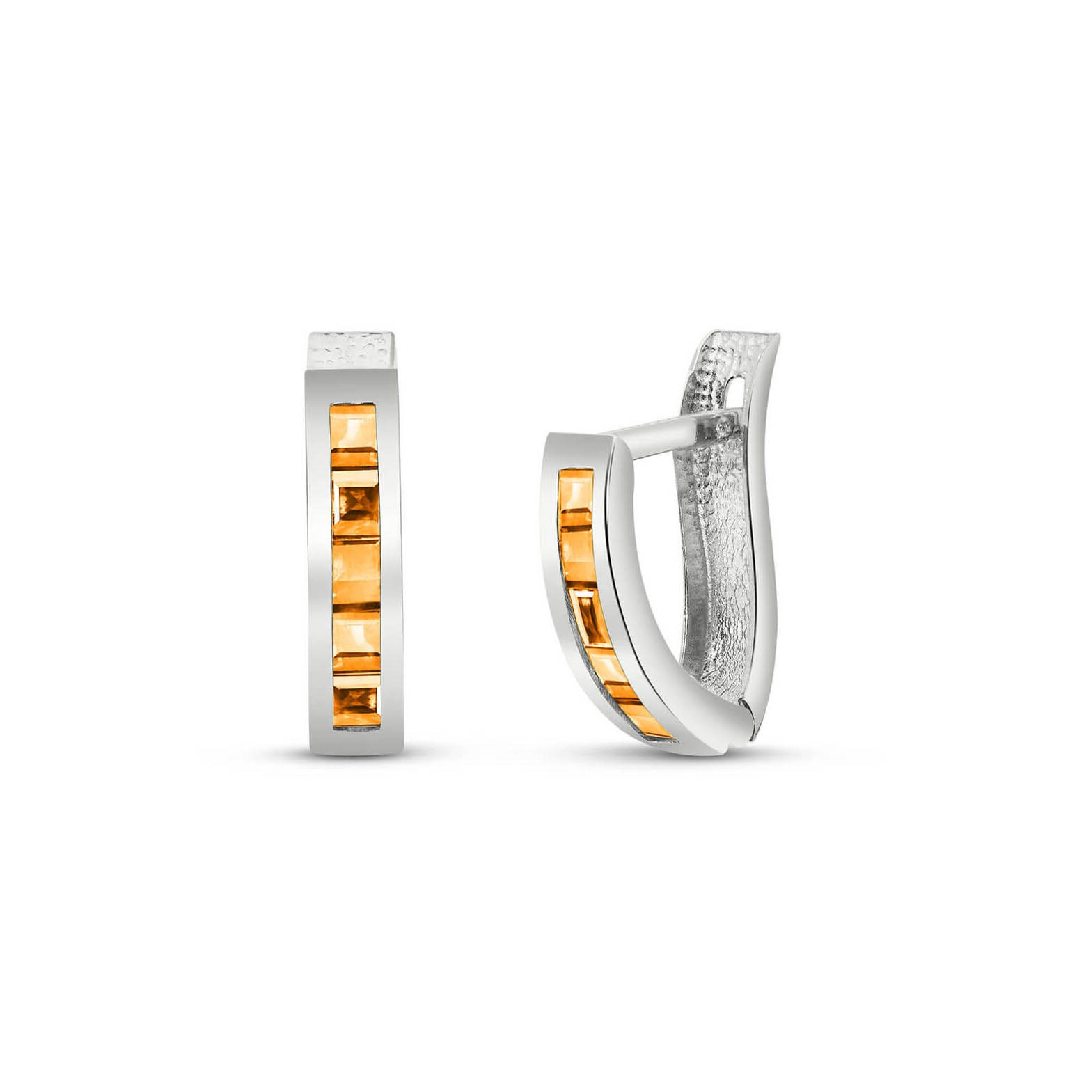 Citrine Hoop Huggie Earrings handcrafted in solid white gold. Ten genuine citrines, total 0.7 ct for both earrings combined. Princess cut. Size: 3.6 x 16 mm (0.14 x 0.63 in). Material: 9ct White Gold. Total metal weight: 1.2 gr. 10 princess cut citrines (2.5 x 2.5 mm) = 0.7 ct total for pair. Colour: Orange. Stone cut: Princess Cut. Anniversary: 13th Anniversary. Birthstone: November.