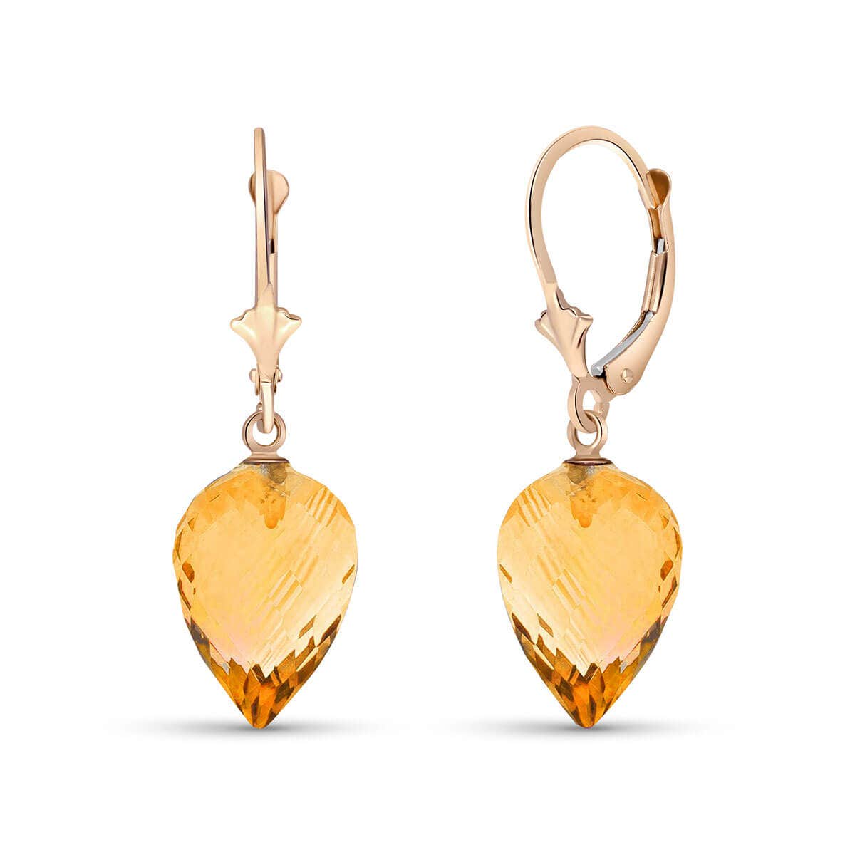 Citrine Chandelierdrop Drop Earrings handcrafted in rose gold plated 9ct gold. Two genuine citrines, total 19 ct for both earrings combined. Pointed briolette cut. Size: 10.2 x 33.3 mm (0.4 x 1.31 in). Material: 9ct Rose Gold. Total metal weight: 4.1 gr. 2 pointed briolette cut citrines (15 x 10 mm) = 19 ct total for pair. Colour: Orange. Stone cut: Pointed Briolette Cut. Anniversary: 13th Anniversary. Birthstone: November.