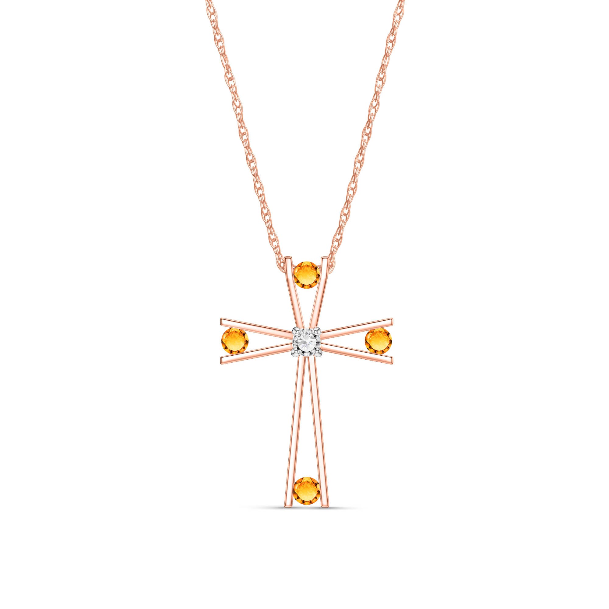 Cross Pendant Necklace handcrafted in rose gold plated 9ct gold. Four genuine citrines, total 0.4 ct, single 0.03 ct diamond. Round cut. The pendant hangs from a rose gold double link rope chain with spring clasp. Size: 20.3 x 30 mm (0.8 x 1.18 in). Material: 9ct Rose Gold. Total metal weight: 1.24 gr. 4 round cut citrines = 0.4 ct total. 1 round brilliant cut diamond (H colour, SI2 clarity) = 0.03 ct. Colour: Orange. Stone cut: Round Cut. Anniversary: 13th Anniversary. Birthstone: November.