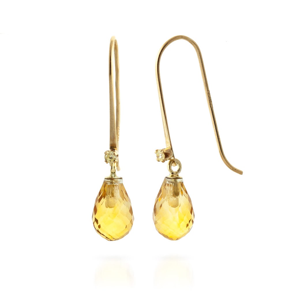 Citrine & Diamond Fish Hook Earrings handcrafted in solid gold. Two genuine citrines, total 1.35 ct, two diamonds, total 0.03 ct for both earrings combined. Briolette cut. Size: 5.1 x 25.4 mm (0.2 x 1 in). Material: 9ct Gold. Total metal weight: 0.9 gr. 2 briolette cut citrines (7 x 5 mm) = 1.35 ct total for pair. 2 round cut diamonds (K colour, SI2 clarity) = 0.03 ct total for pair. Colour: Orange. Stone cut: Briolette Cut. Anniversary: 13th Anniversary. Birthstone: November.