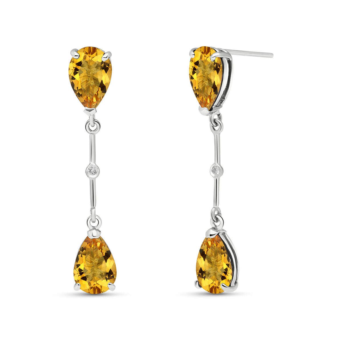 Citrine & Diamond Chandelier Earrings handcrafted in solid white gold. Four genuine citrines, total 6 ct, two diamonds, total 0.01 ct for both earrings combined. Pear cut. Size: 6.1 x 35.1 mm (0.24 x 1.38 in). Material: 9ct White Gold. Total metal weight: 2.6 gr. 4 pear cut citrines (9 x 6 mm) = 6 ct total for pair. 2 round cut diamonds (G colour, SI2 clarity) = 0.01 ct total for pair. Colour: Orange. Stone cut: Pear Cut. Anniversary: 13th Anniversary. Birthstone: November.