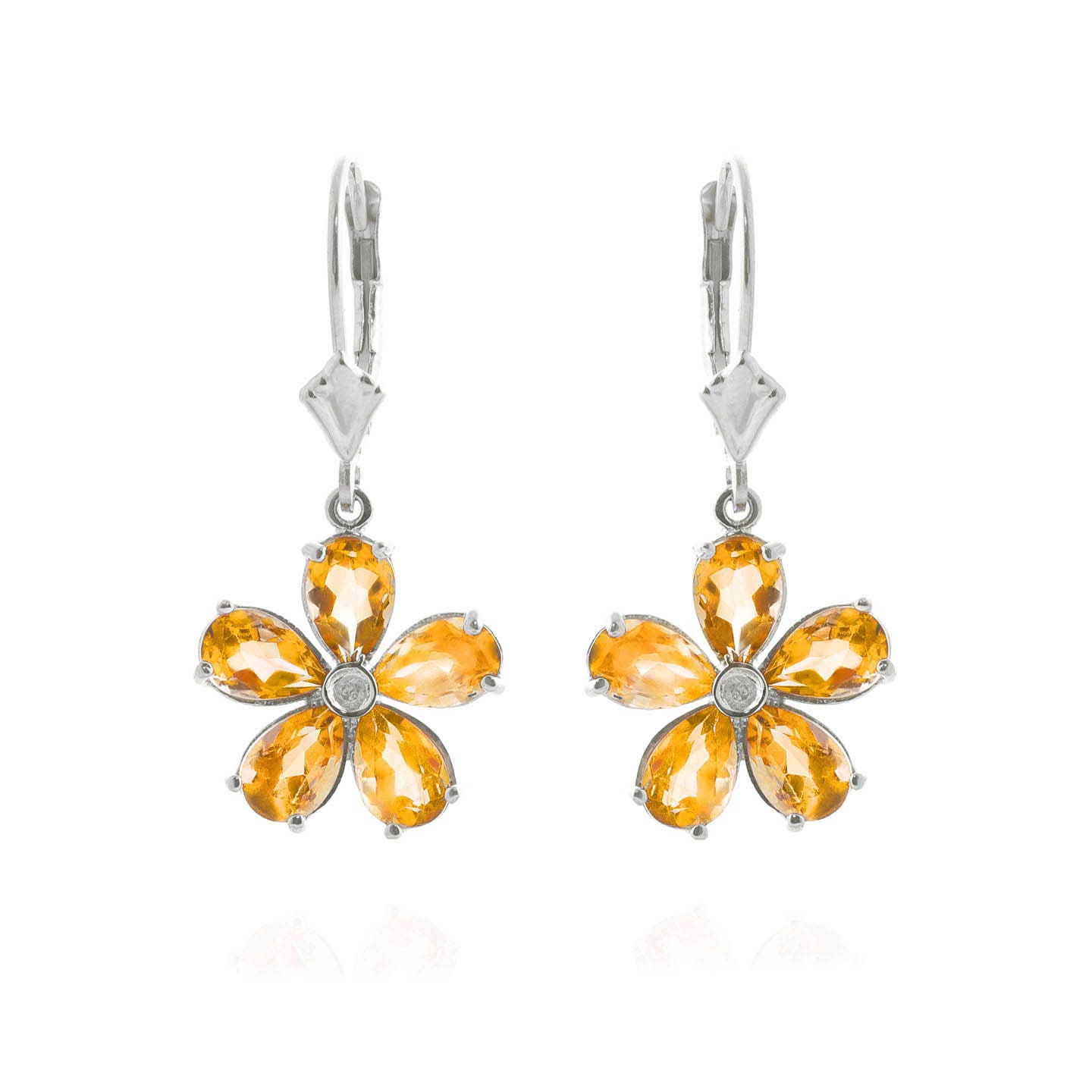 Citrine & Diamond Leverback Earrings handcrafted in solid white gold. Ten genuine citrines, total 4.4 ct, two diamonds, total 0.03 ct for both earrings combined. Pear cut. Size: 14.2 x 30.2 mm (0.56 x 1.19 in). Material: 9ct White Gold. Total metal weight: 3.1 gr. 10 pear cut citrines (6 x 4 mm) = 4.4 ct total for pair. 2 round cut diamonds (K colour, SI1 clarity) = 0.03 ct total for pair. Colour: Orange. Stone cut: Pear Cut. Anniversary: 13th Anniversary. Birthstone: November.