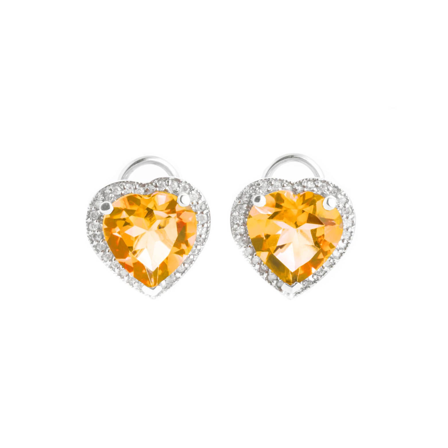 Citrine & Diamond French Clip Earrings handcrafted in solid white gold. Two genuine citrines, total 6.2 ct, 58 diamonds, total 0.28 ct for both earrings combined. Heart shaped. Size: 13 x 12.7 mm (0.51 x 0.5 in). Material: 9ct White Gold. Total metal weight: 4.3 gr. 2 heart shaped citrines (10 x 10 mm) = 6.2 ct total for pair. 58 round cut diamonds (K colour, I3 clarity) = 0.28 ct total for pair. Colour: Orange. Stone cut: Heart Shaped. Anniversary: 13th Anniversary. Birthstone: November.