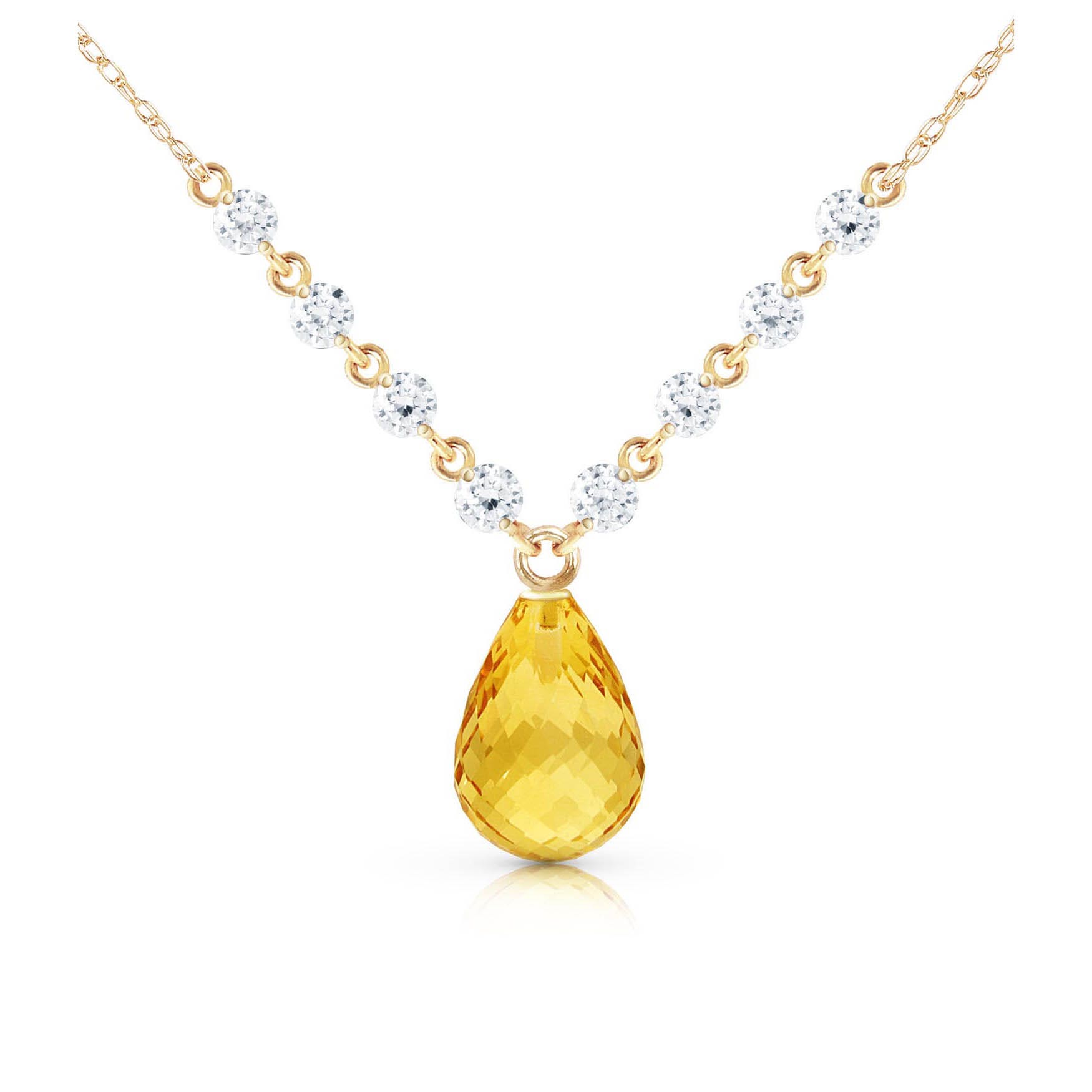 Citrine & Diamond Pendant Necklace handcrafted in solid gold. Single 10.5 ct genuine citrine, eight diamonds, total 0.8 ct. Briolette cut. The pendant is suspended from a gold double link rope chain with spring clasp. Size: 16.8 mm (0.66 in). Material: 9ct Gold. Total metal weight: 4.44 gr. 1 briolette cut citrine (14 x 10 mm) = 10.5 ct. 8 round cut diamonds (K colour, I3 clarity) = 0.8 ct total. Colour: Orange. Stone cut: Briolette Cut. Anniversary: 13th Anniversary. Birthstone: November.
