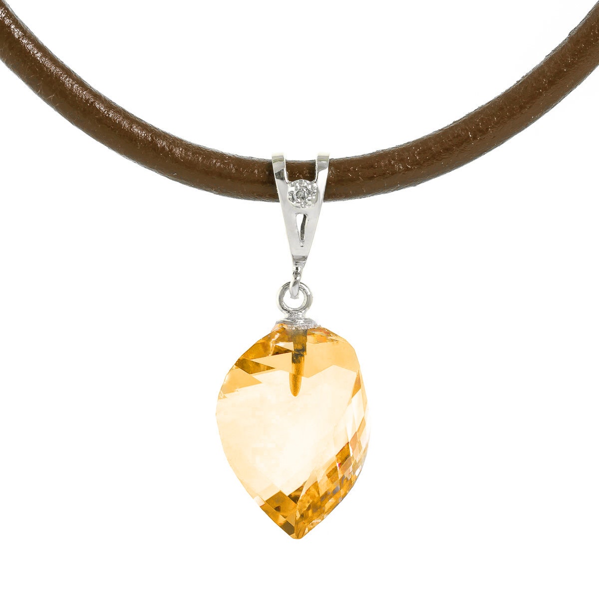 Citrine & Diamond Pendant Necklace handcrafted in solid white gold. Single 11.75 ct genuine citrine, single 0.01 ct diamond. Twisted briolette cut. The pendant hangs from a white gold double link rope chain with spring clasp. Size: 12.7 x 27.9 mm (0.5 x 1.1 in). Material: 9ct White Gold. Total metal weight: 5.64 gr. 1 twisted briolette cut citrine (15 x 13 mm) = 11.75 ct. 1 round brilliant cut diamond (K colour, I3 clarity) = 0.01 ct. Colour: Orange. Stone cut: Twisted Briolette Cut. Anniversary: 13th Anniversary. Birthstone: November.