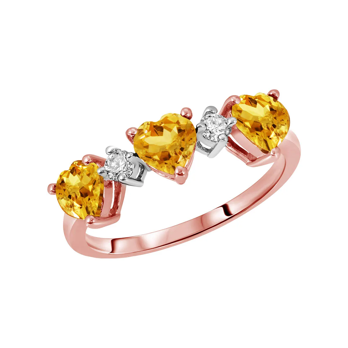 Citrine & Diamond Ring handcrafted in solid 18ct rose gold. Three genuine citrines, total 1.35 ct, two diamonds, total 0.15 ct. Heart shaped. Available from sizes H to Z including half sizes. Size: 5.6 mm (0.22 in). Material: 18ct Rose Gold. Total metal weight: 2.6 gr. 3 heart shaped citrines (5 x 5 mm) = 1.35 ct total. 2 round cut diamonds (K colour, SI1 clarity) = 0.15 ct total. Colour: Orange. Stone cut: Heart Shaped. Anniversary: 13th Anniversary. Birthstone: November.