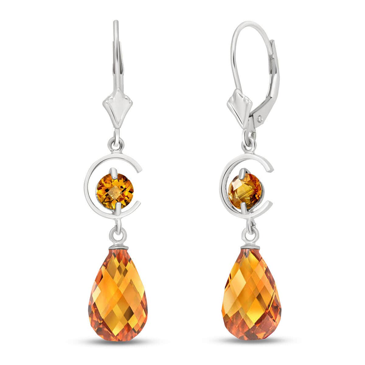Citrine Leverback Earrings handcrafted in solid white gold. Four gemstones, total 11 ct for both earrings combined. Briolette cut. Size: 7.9 x 41.1 mm (0.31 x 1.62 in). Material: 9ct White Gold. Total metal weight: 3.1 gr. 2 briolette cut citrines (12 x 8 mm) = 10 ct total for pair. 2 round cut citrines (5 x 5 mm) = 1 ct total for pair. Colour: Orange. Stone cut: Briolette Cut. Anniversary: 13th Anniversary. Birthstone: November.