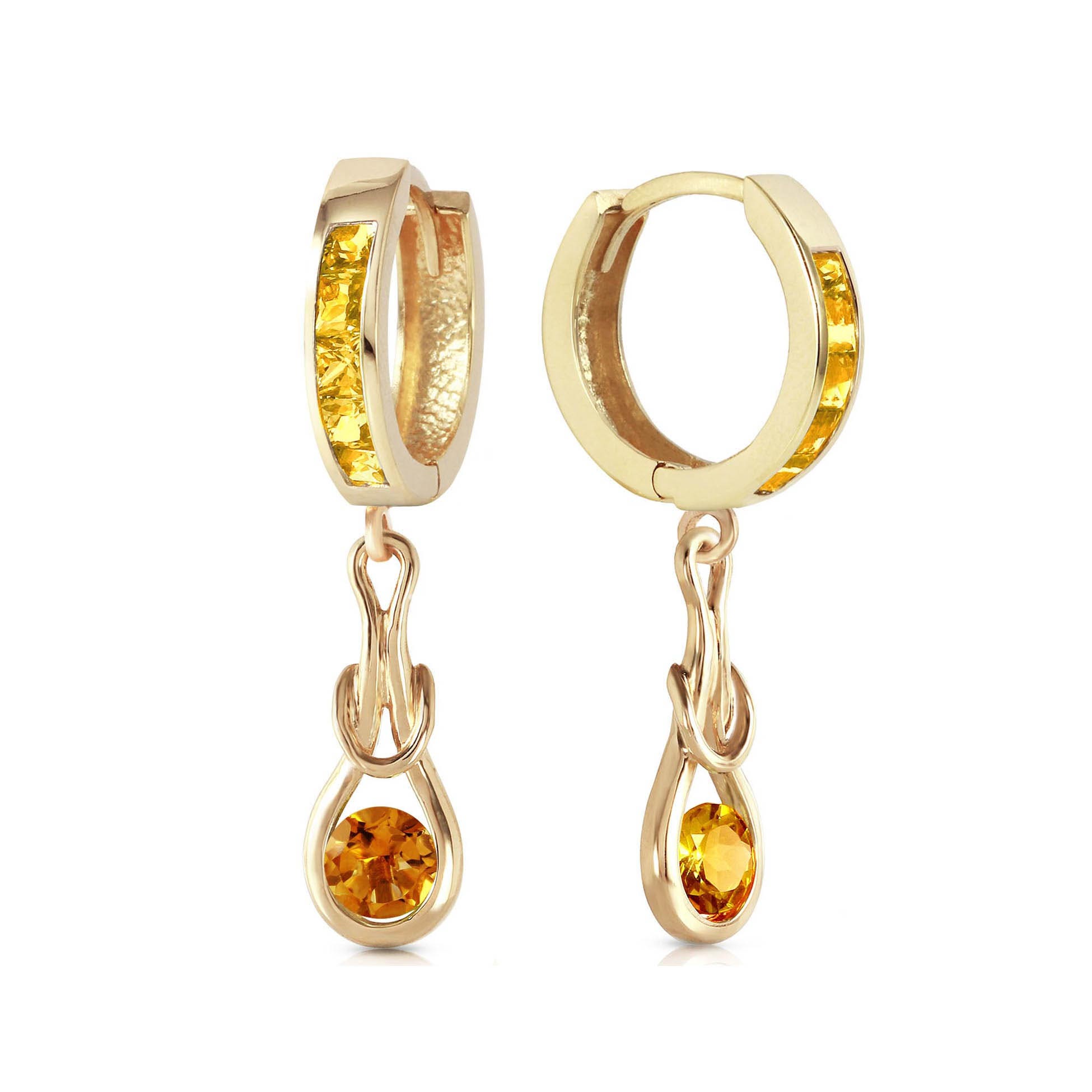 Citrine Hoop Huggie Earrings handcrafted in solid 9ct gold. Twelve gemstones, total 2 ct for both earrings combined. Princess cut. Size: 7.6 x 29.5 mm (0.3 x 1.16 in). Material: 9ct Gold. Total metal weight: 2.9 gr. 10 princess cut citrines (2.5 x 2.5 mm) = 0.7 ct total for pair. 2 round cut citrines (5 x 5 mm) = 1.3 ct total for pair. Colour: Orange. Stone cut: Princess Cut. Anniversary: 13th Anniversary. Birthstone: November.