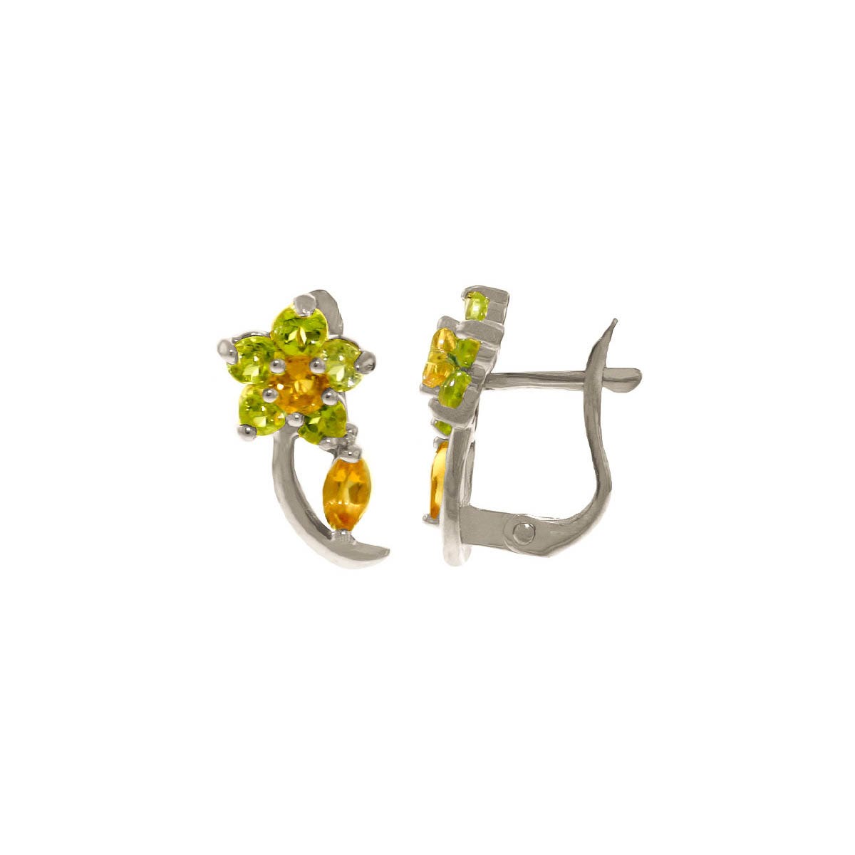 Citrine & Peridot Stud Flower Earrings handcrafted in solid white gold. 14 gemstones, total 1.72 ct for both earrings combined. Round cut. Post with friction back to fasten. Size: 7.9 x 14.7 mm (0.31 x 0.58 in). Material: 9ct White Gold. Total metal weight: 1.7 gr. 2 round cut citrines (3 x 3 mm) = 0.32 ct total for pair. 2 marquise cut citrines (4 x 2 mm) = 0.15 ct total for pair. 10 round cut peridots (2.5 x 2.5 mm) = 1.25 ct total for pair. Colour: Orange. Stone cut: Round Cut. Anniversary: 13th Anniversary. Birthstone: November.