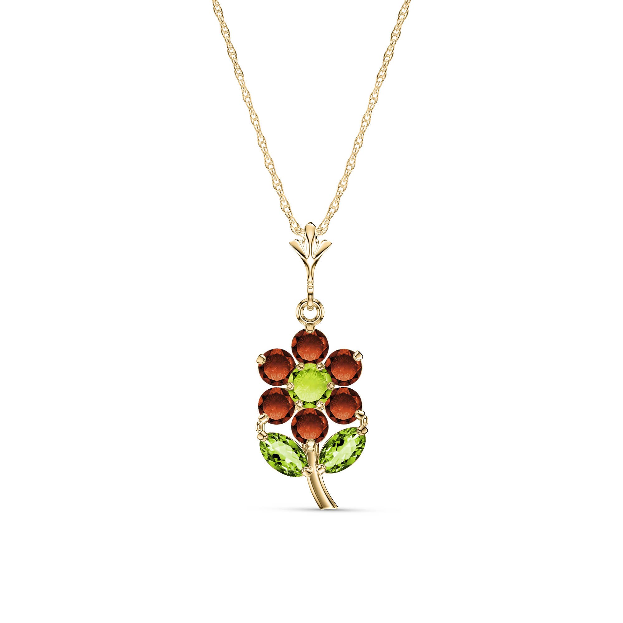 Citrine, Peridot & Garnet Flower Pendant Necklace handcrafted in solid gold. Nine gemstones, total 1.06 ct. Round cut. The pendant hangs from a gold double link rope chain with spring clasp. Size: 8.1 x 22.1 mm (0.32 x 0.87 in). Material: 9ct Gold. Total metal weight: 1.84 gr. 1 round cut citrine (3 x 3 mm) = 0.16 ct. 2 marquise cut peridots (4 x 2 mm) = 0.15 ct total. 6 round cut garnets (2.5 x 2.5 mm) = 0.75 ct total. Colour: Orange. Stone cut: Round Cut. Anniversary: 13th Anniversary. Birthstone: November.