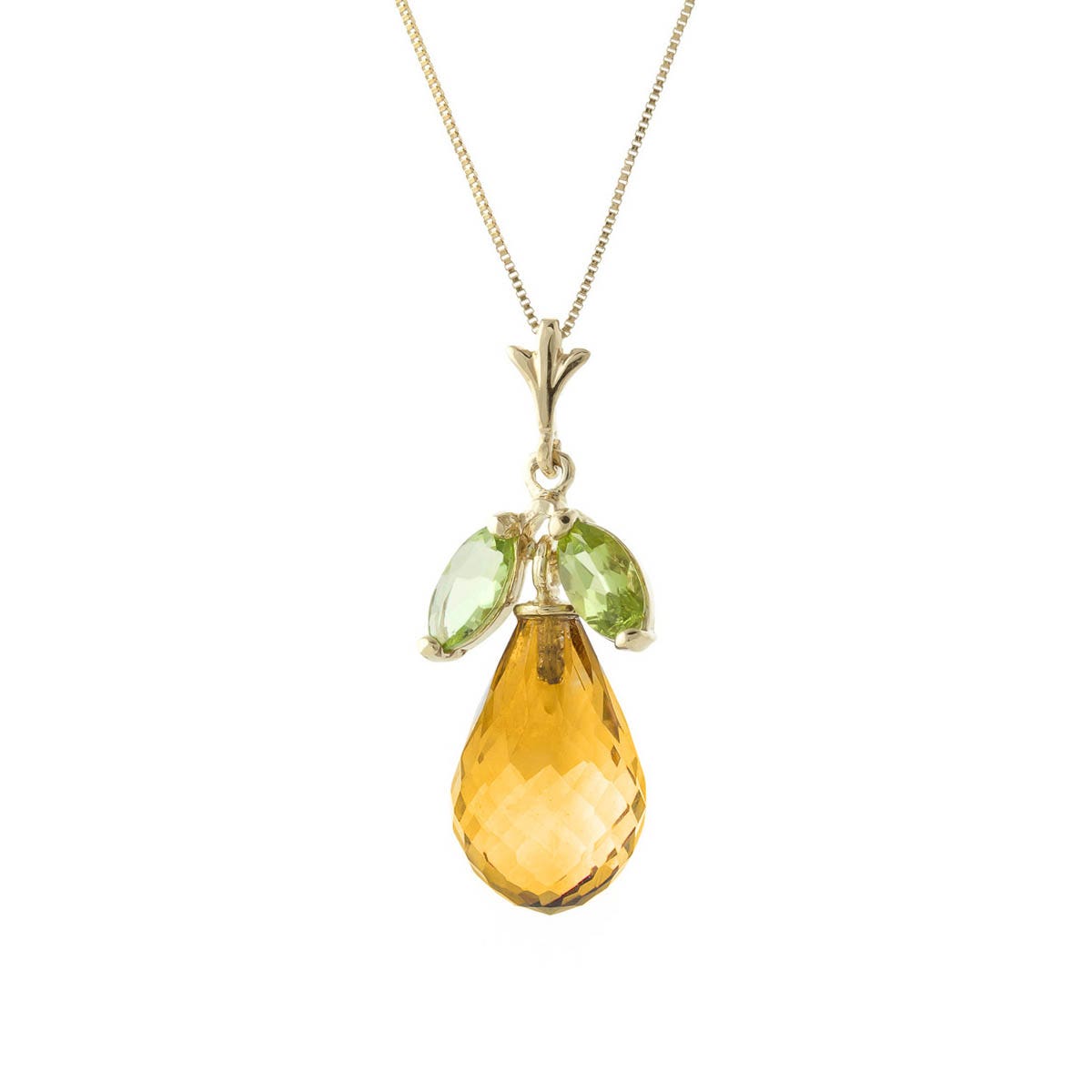 Citrine & Peridot Pendant Necklace handcrafted in solid gold. Three gemstones, total 7.2 ct. Briolette cut. The pendant hangs from a gold box chain with spring clasp. Size: 10.2 x 24.4 mm (0.4 x 0.96 in). Material: 9ct Gold. Total metal weight: 3.1 gr. 1 briolette cut citrine (12 x 8 mm) = 6.7 ct. 2 marquise cut peridots (6 x 3 mm) = 0.5 ct total. Colour: Orange. Stone cut: Briolette Cut. Anniversary: 13th Anniversary. Birthstone: November.