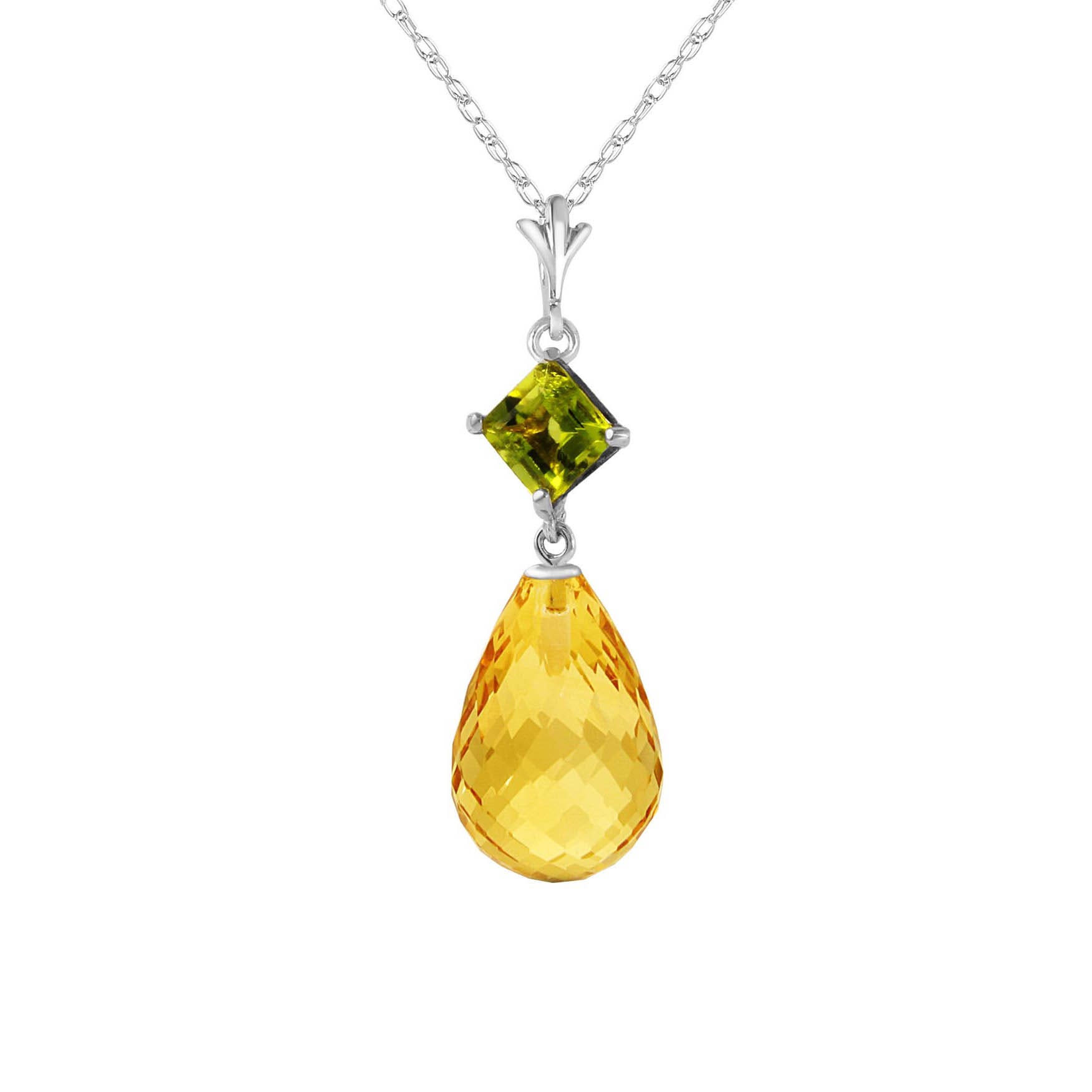 Citrine & Peridot Pendant Necklace handcrafted in solid white gold. Two gemstones, total 5.5 ct. Briolette cut. The pendant is suspended from a white gold double link rope chain with spring clasp. Size: 7.9 x 28.2 mm (0.31 x 1.11 in). Material: 9ct White Gold. Total metal weight: 2.04 gr. 1 briolette cut citrine (12 x 8 mm) = 5 ct. 1 square cut peridot (4 x 4 mm) = 0.5 ct. Colour: Orange. Stone cut: Briolette Cut. Anniversary: 13th Anniversary. Birthstone: November.