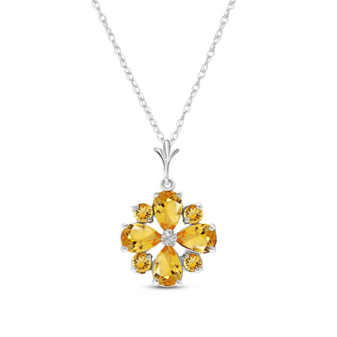 Citrine Pendant Necklace handcrafted in solid white gold. Eight gemstones, total 2.43 ct. Pear cut. The pendant hangs from a white gold double link rope chain with spring clasp. Size: 14 x 21.6 mm (0.55 x 0.85 in). Material: 9ct White Gold. Total metal weight: 2.24 gr. 4 pear cut citrines (6 x 4 mm) = 1.63 ct total. 4 round cut citrines (3 x 3 mm) = 0.8 ct total. Colour: Orange. Stone cut: Pear Cut. Anniversary: 13th Anniversary. Birthstone: November.