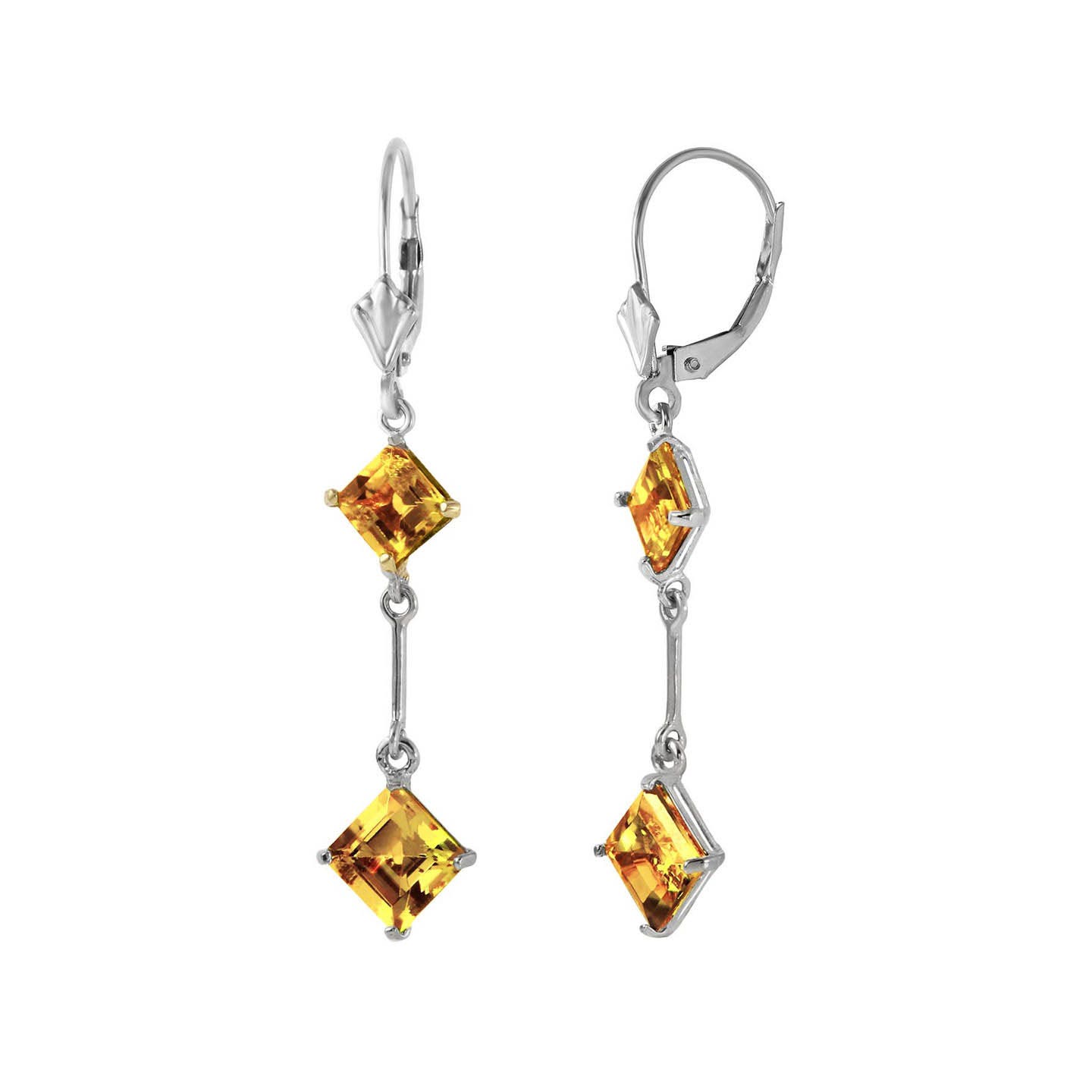 Citrine Leverback Earrings handcrafted in solid white gold. Four gemstones, total 3.75 ct for both earrings combined. Square cut. Size: 9.1 x 43.9 mm (0.36 x 1.73 in). Material: 9ct White Gold. Total metal weight: 2.1 gr. 2 square cut citrines (5 x 5 mm) = 1.2 ct total for pair. 2 square cut citrines (6 x 6 mm) = 2.55 ct total for pair. Colour: Orange. Stone cut: Square Cut. Anniversary: 13th Anniversary. Birthstone: November.