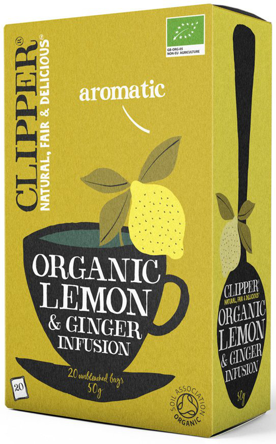20 bags organic vegan friendly Clipper Lemon & ginger Teabags.This product is suitable for a gluten free diet.These teabags are plastic free made from a natural plant based material of abaca (type of banana) plant cellulose fibres and PLA from non-
