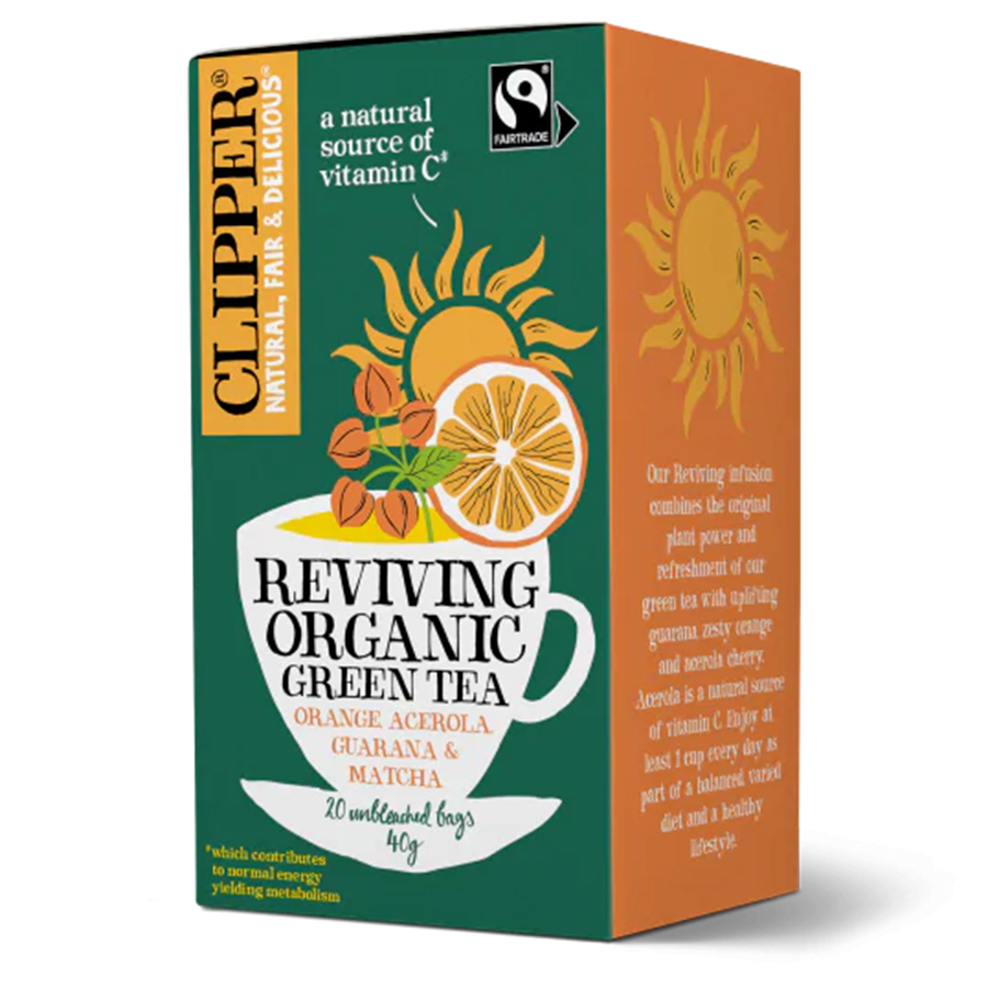 Experience the revitalising blend of this reviving organic green tea from Clipper bringing together the natural plant potency and freshness of green tea with the invigorating elements of guarana zesty orange and acerola berry. Acerola serves as a