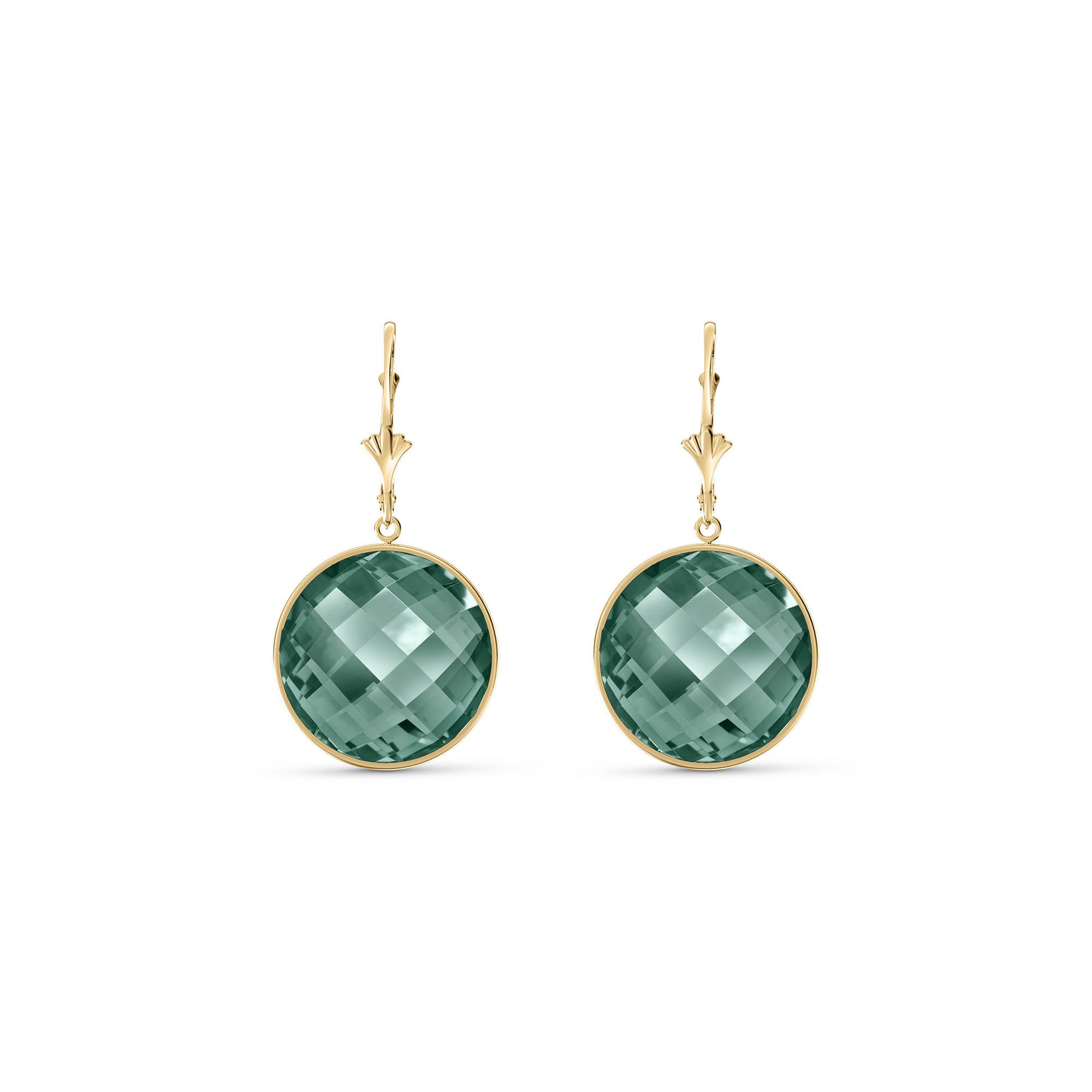 Corundum Leverback Earrings handcrafted in solid gold. Two genuine corundum, total 46 ct for both earrings combined. Round cut. Size: 18.5 x 36.1 mm (0.73 x 1.42 in). Material: 9ct Gold. Total metal weight: 1.4 gr. 2 round cut corundum (18 x 18 mm) = 46 ct total for pair. Colour: Green. Stone cut: Round Cut.