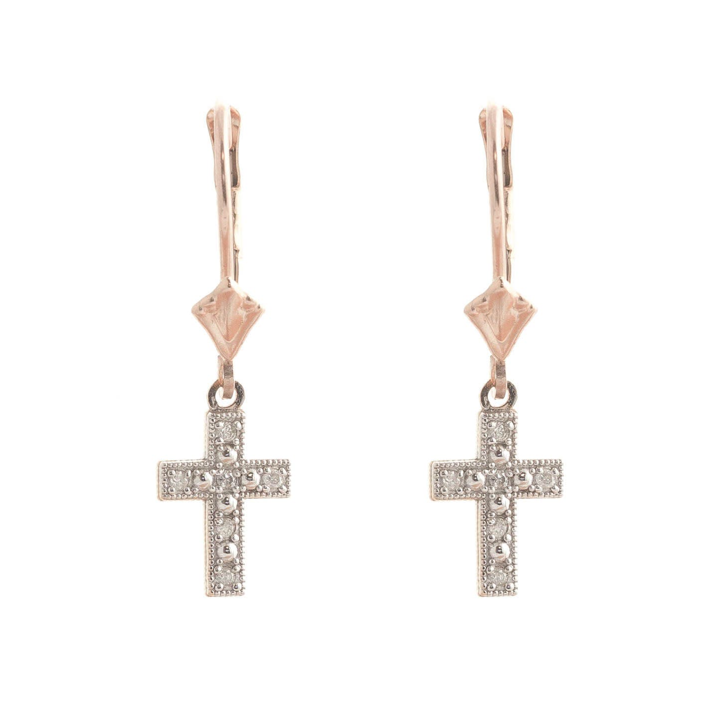 Diamond Leverback Cross Earrings handcrafted in rose gold plated 9ct gold. Twelve diamonds, total 0.06 ct for both earrings combined. Round cut. Size: 7.4 x 26.4 mm (0.29 x 1.04 in). Material: 9ct Rose Gold. Total metal weight: 1.2 gr. 12 round cut diamonds (K colour, SI2 clarity) = 0.06 ct total for pair. Colour: Clear. Diamond colour: K. Stone cut: Round Cut. Anniversary: 10th Anniversary, 60th Anniversary. Birthstone: April.