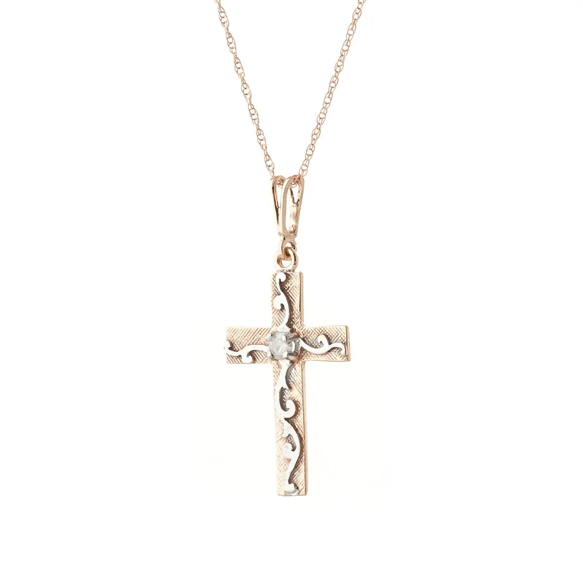 Diamond Cross Pendant Necklace handcrafted in rose gold plated 9ct gold. Single 0.05 ct diamond. Round brilliant cut. The pendant hangs from a rose gold double link rope chain with spring clasp. Size: 13 x 28.7 mm (0.51 x 1.13 in). Material: 9ct Rose Gold. Total metal weight: 1.94 gr. 1 round brilliant cut diamond (K colour, I3 clarity) = 0.05 ct. Colour: Clear. Diamond colour: K. Stone cut: Round Cut. Anniversary: 10th Anniversary, 60th Anniversary. Birthstone: April.