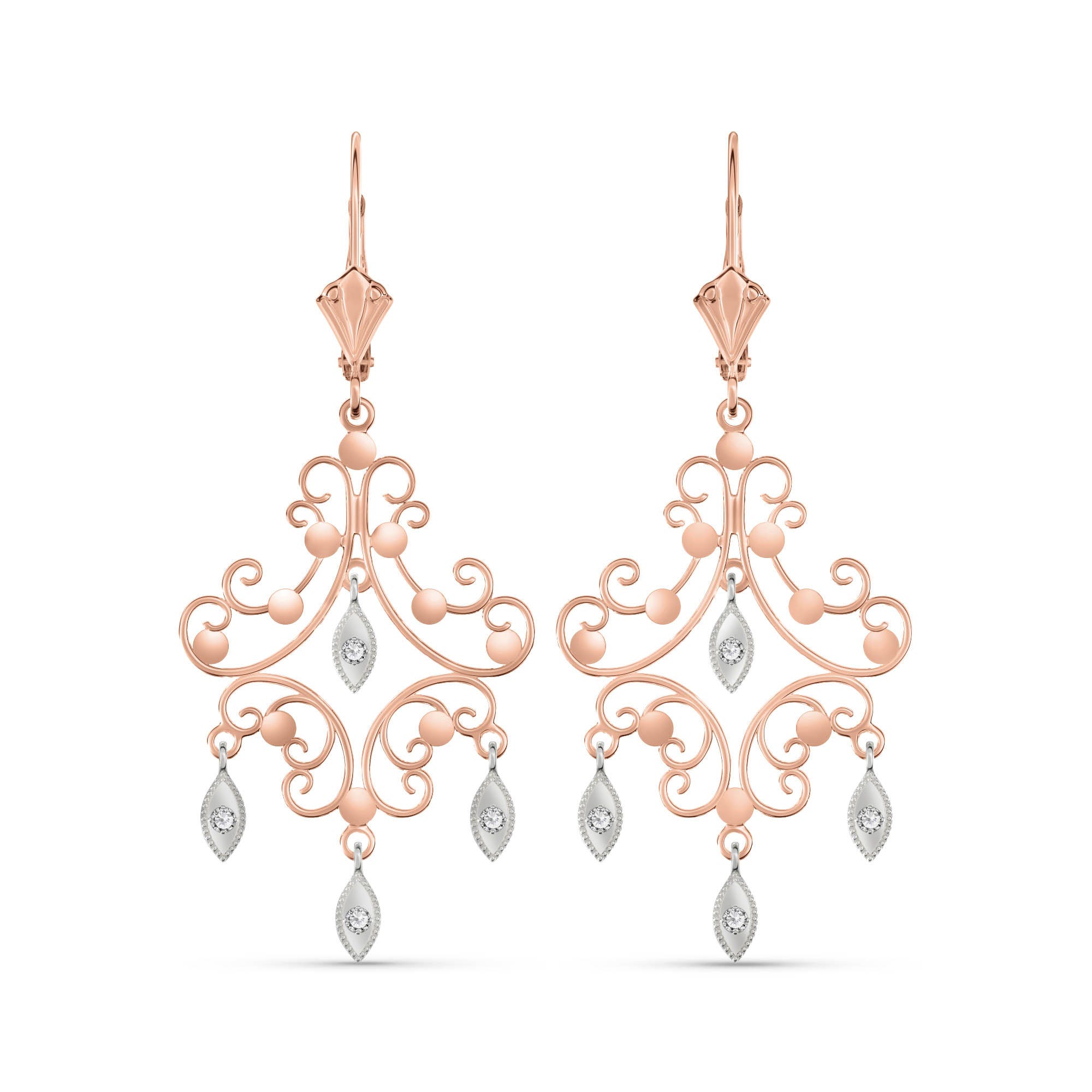 Diamond Chandelierdrop Earrings handcrafted in rose gold plated 9ct gold. Eight diamonds, total 0.04 ct for both earrings combined. Round cut. Size: 20.3 x 46.5 mm (0.8 x 1.83 in). Material: 9ct Rose Gold. Total metal weight: 2.8 gr. 8 round cut diamonds (K colour, SI2 clarity) = 0.04 ct total for pair. Colour: Clear. Diamond colour: K. Stone cut: Round Cut. Anniversary: 10th Anniversary, 60th Anniversary. Birthstone: April.
