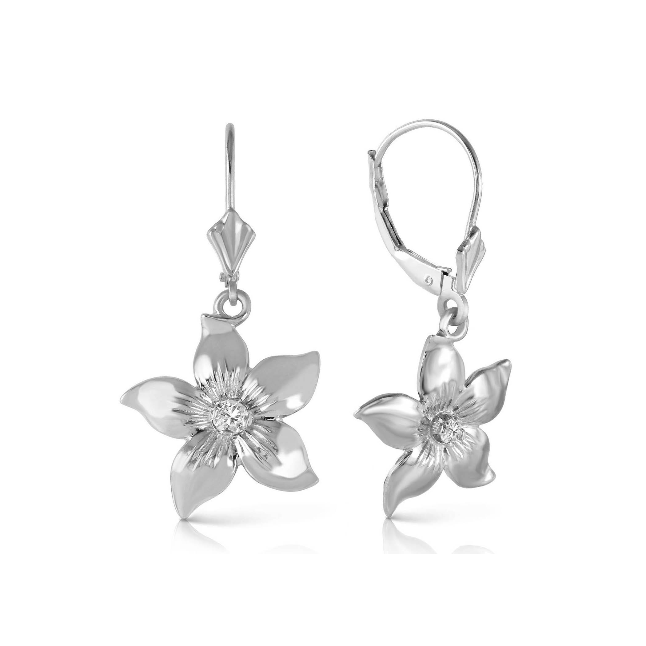 Diamond Leverback Flower Earrings handcrafted in solid white gold. Two diamonds, total 0.1 ct for both earrings combined. Round cut. Size: 15.2 x 32.5 mm (0.6 x 1.28 in). Material: 9ct White Gold. Total metal weight: 2.9 gr. 2 round cut diamonds (K colour, I3 clarity) = 0.1 ct total for pair. Colour: Clear. Diamond colour: K. Stone cut: Round Cut. Anniversary: 10th Anniversary, 60th Anniversary. Birthstone: April.