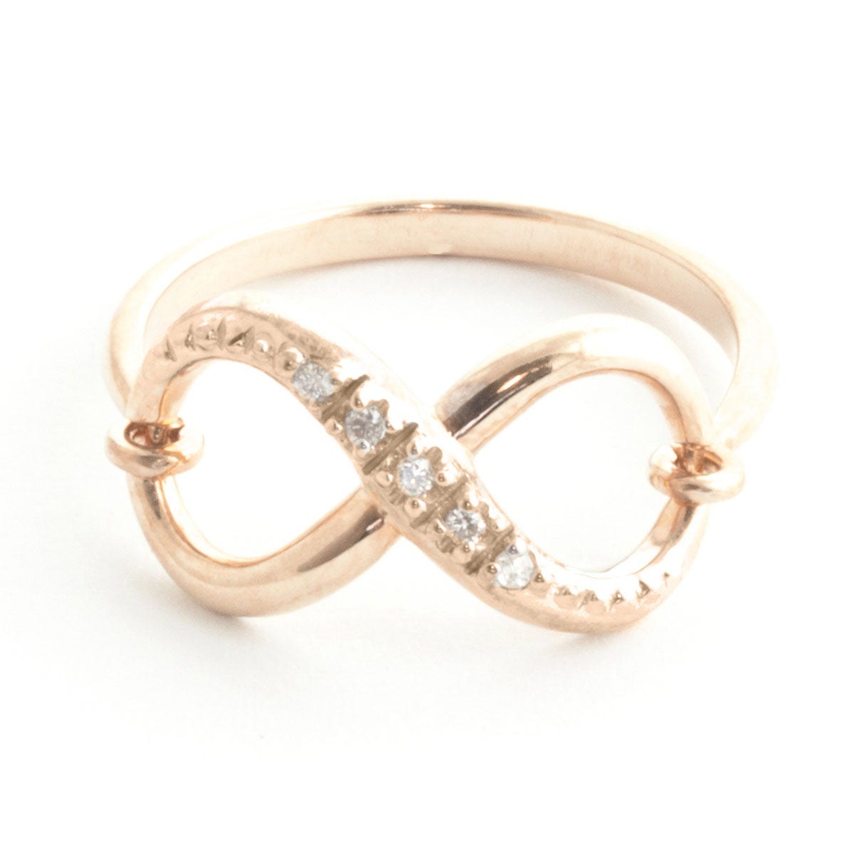 Diamond Ring handcrafted in solid rose gold. Five diamonds, total 0.03 ct. Round cut. Available from sizes H to Z including half sizes. Size: 9.4 mm (0.37 in). Material: 9ct Rose Gold. Total metal weight: 1.9 gr. 5 round cut diamonds (G colour, SI2 clarity) = 0.03 ct total. Colour: Clear. Diamond colour: G. Stone cut: Round Cut. Anniversary: 10th Anniversary, 60th Anniversary. Birthstone: April.