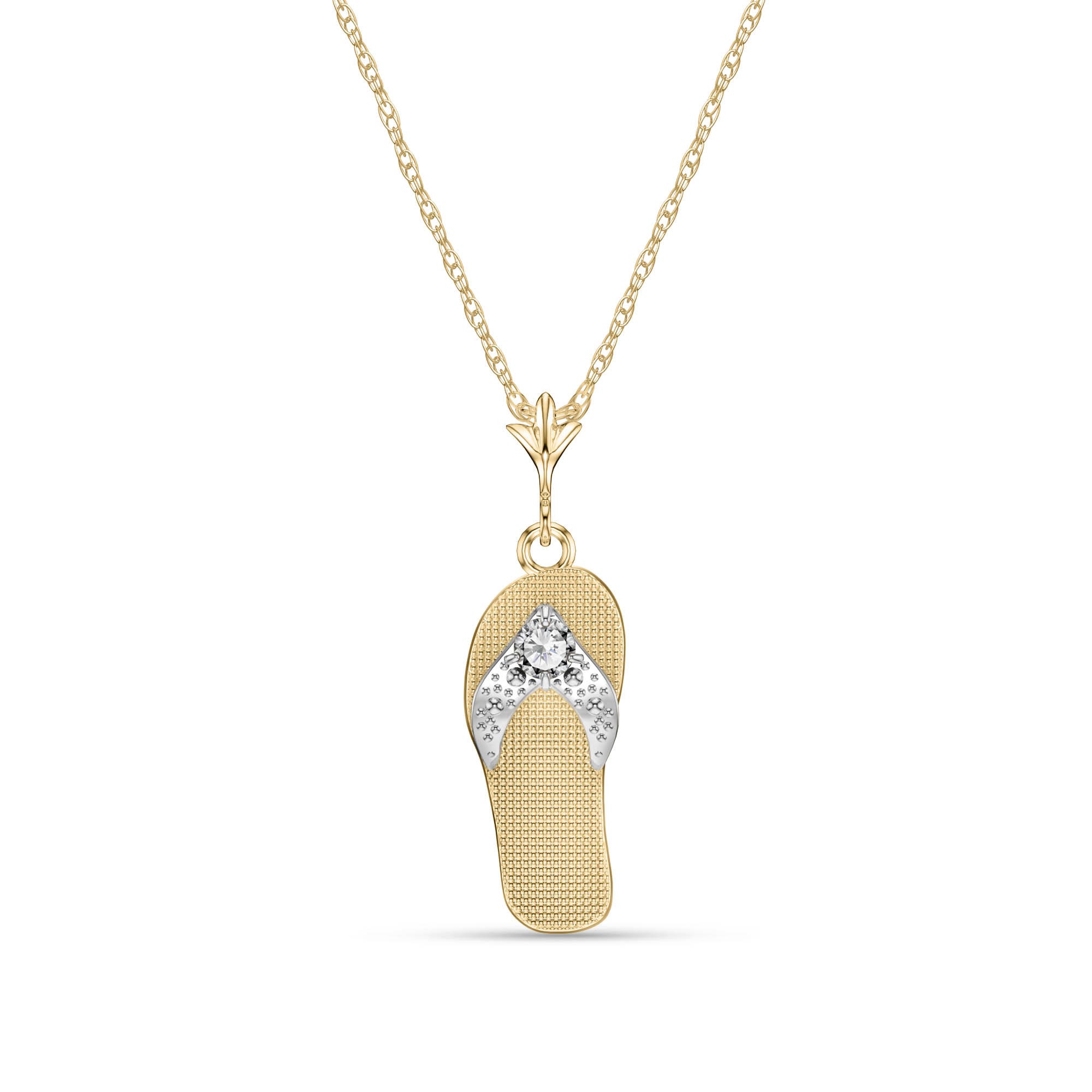 Diamond Sandal Pendant Necklace handcrafted in solid gold. Three diamonds, total 0.02 ct. Round cut. The pendant is suspended from a gold double link rope chain with spring clasp. Size: 7.4 x 24.1 mm (0.29 x 0.95 in). Material: 9ct Gold. Total metal weight: 1.94 gr. 3 round cut diamonds (K colour, SI2 clarity) = 0.02 ct total. Colour: Clear. Diamond colour: K. Stone cut: Round Cut. Anniversary: 10th Anniversary, 60th Anniversary. Birthstone: April.