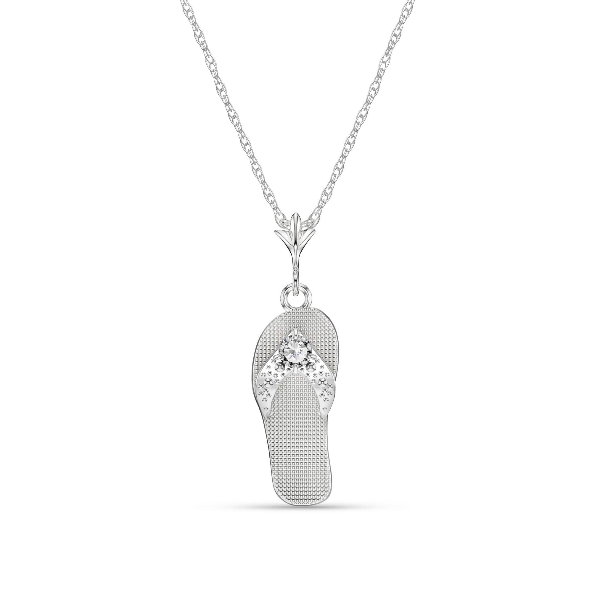 Diamond Sandal Pendant Necklace handcrafted in solid white gold. Three diamonds, total 0.02 ct. Round cut. The pendant is suspended from a white gold double link rope chain with spring clasp. Size: 7.4 x 24.1 mm (0.29 x 0.95 in). Material: 9ct White Gold. Total metal weight: 1.94 gr. 3 round cut diamonds (K colour, SI2 clarity) = 0.02 ct total. Colour: Clear. Diamond colour: K. Stone cut: Round Cut. Anniversary: 10th Anniversary, 60th Anniversary. Birthstone: April.