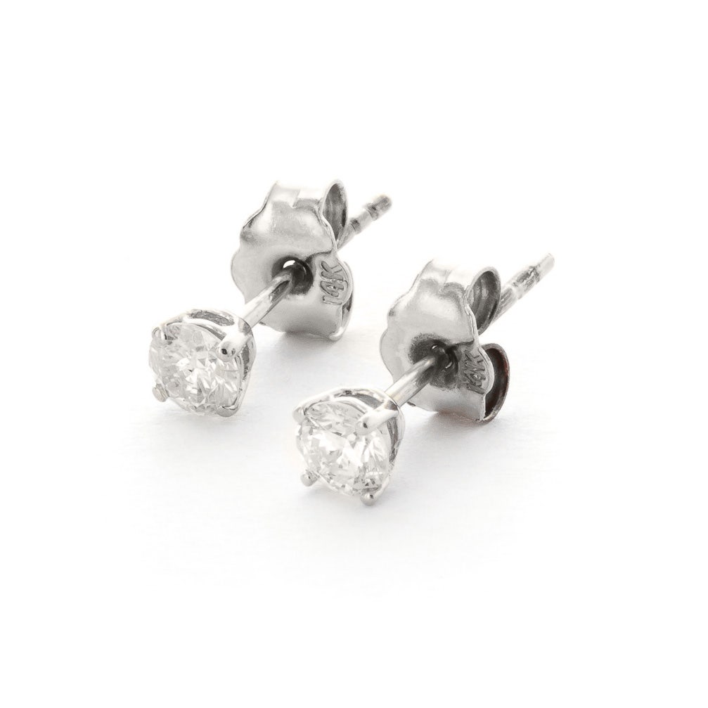 Diamond Stud Earrings handcrafted in solid white gold. Two diamonds, total 0.3 ct for both earrings combined. Round cut. Post with friction back to fasten. Size: 3.3 x 3.3 mm (0.13 x 0.13 in). Material: 9ct White Gold. Total metal weight: 0.5 gr. 2 round cut diamonds (H colour, SI2 clarity) = 0.3 ct total for pair. Colour: Clear. Diamond colour: H. Stone cut: Round Cut. Anniversary: 10th Anniversary, 60th Anniversary. Birthstone: April.