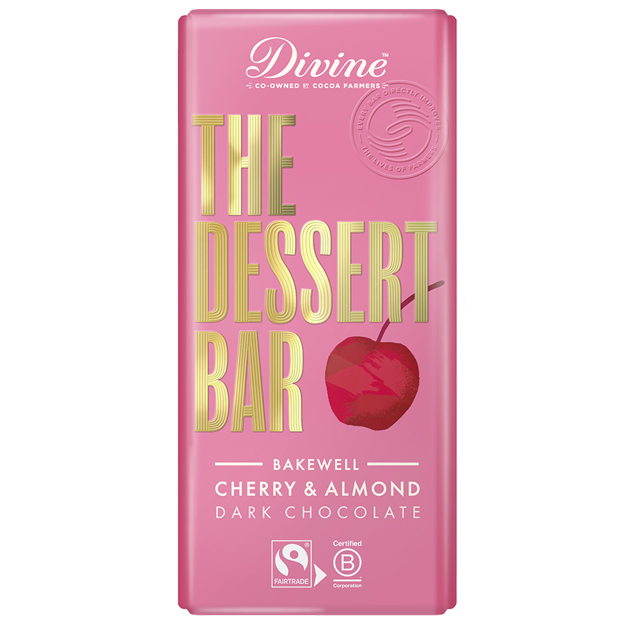 Satisfy your sweet tooth with Divine’s deliciously smooth Fairtrade dark chocolate generously packed with almonds and dried cherries. Inspired by the delightful taste of Bakewell tarts this chocolate bar offers all the flavour of a dessert without