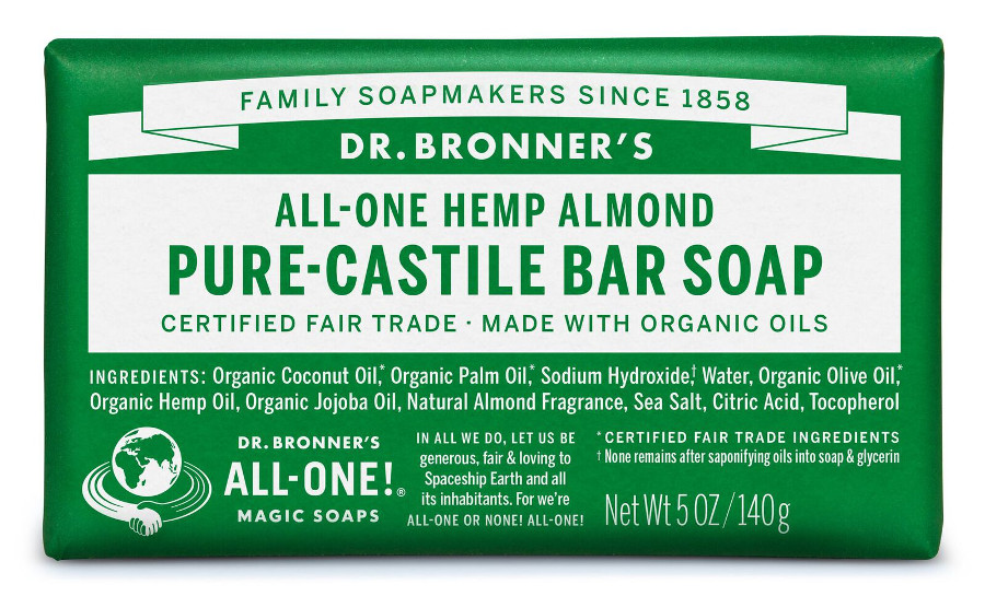 The almond soap bar is a warm comforting blend of delicious almond fragrance with organic olive coconut jojoba and hemp oils. Dr. Bronner’s Pure Castile Soaps contain no synthetic ingredients.All oils and essential oils are certified organic to th
