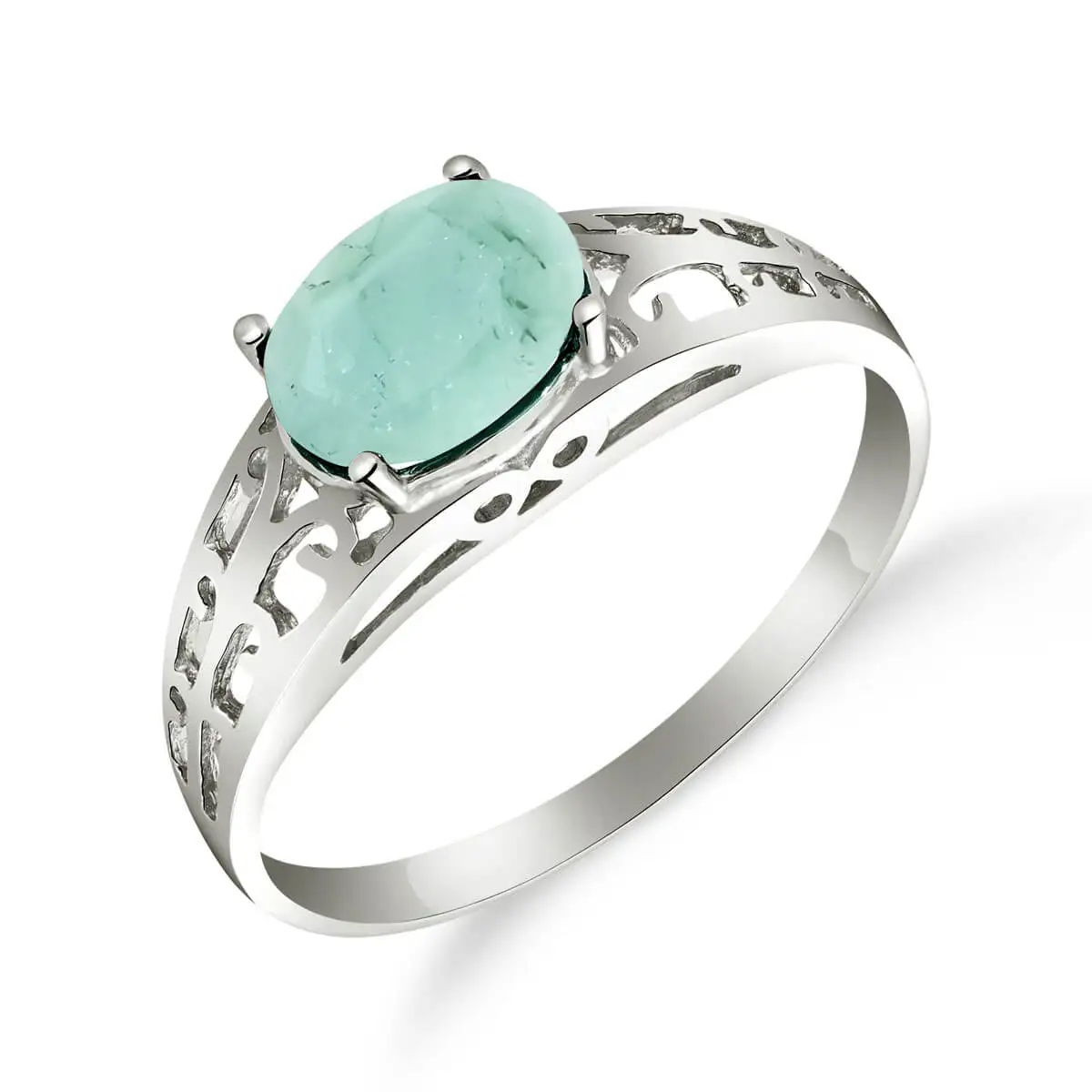 Emerald Ring handcrafted in solid white gold. Single 1.15 ct genuine emerald. Oval cut. Available from sizes H to Z including half sizes. Size: 5.3 mm (0.21 in). Material: 9ct White Gold. Total metal weight: 1.7 gr. 1 oval cut emerald (7 x 5 mm) = 1.15 ct. Colour: Green. Stone cut: Oval Cut. Anniversary: 20th Anniversary, 35th Anniversary. Birthstone: May.