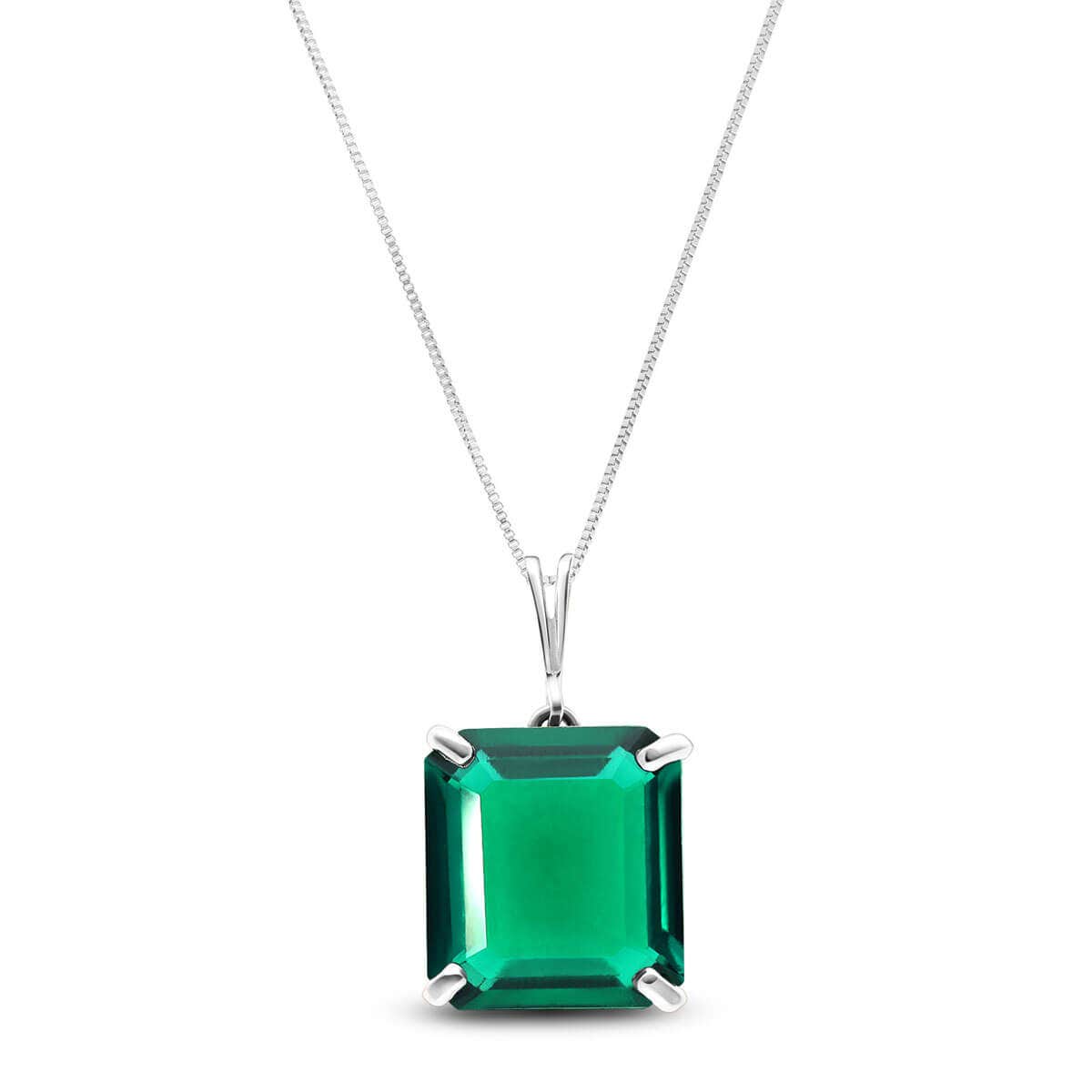 Lab Grown Emerald Pendant Necklace handcrafted in solid white gold. Single 4.5 ct lab grown emerald. Emerald cut. The pendant hangs from a white gold double link rope chain with spring clasp. Size: 9.9 x 21.3 mm (0.39 x 0.84 in). Material: 9ct White Gold. Total metal weight: 2.64 gr. 1 emerald cut lab grown emerald (12 x 10 mm) = 4.5 ct. Colour: Green. Stone cut: Emerald Cut. Anniversary: 20th Anniversary, 35th Anniversary. Birthstone: May.