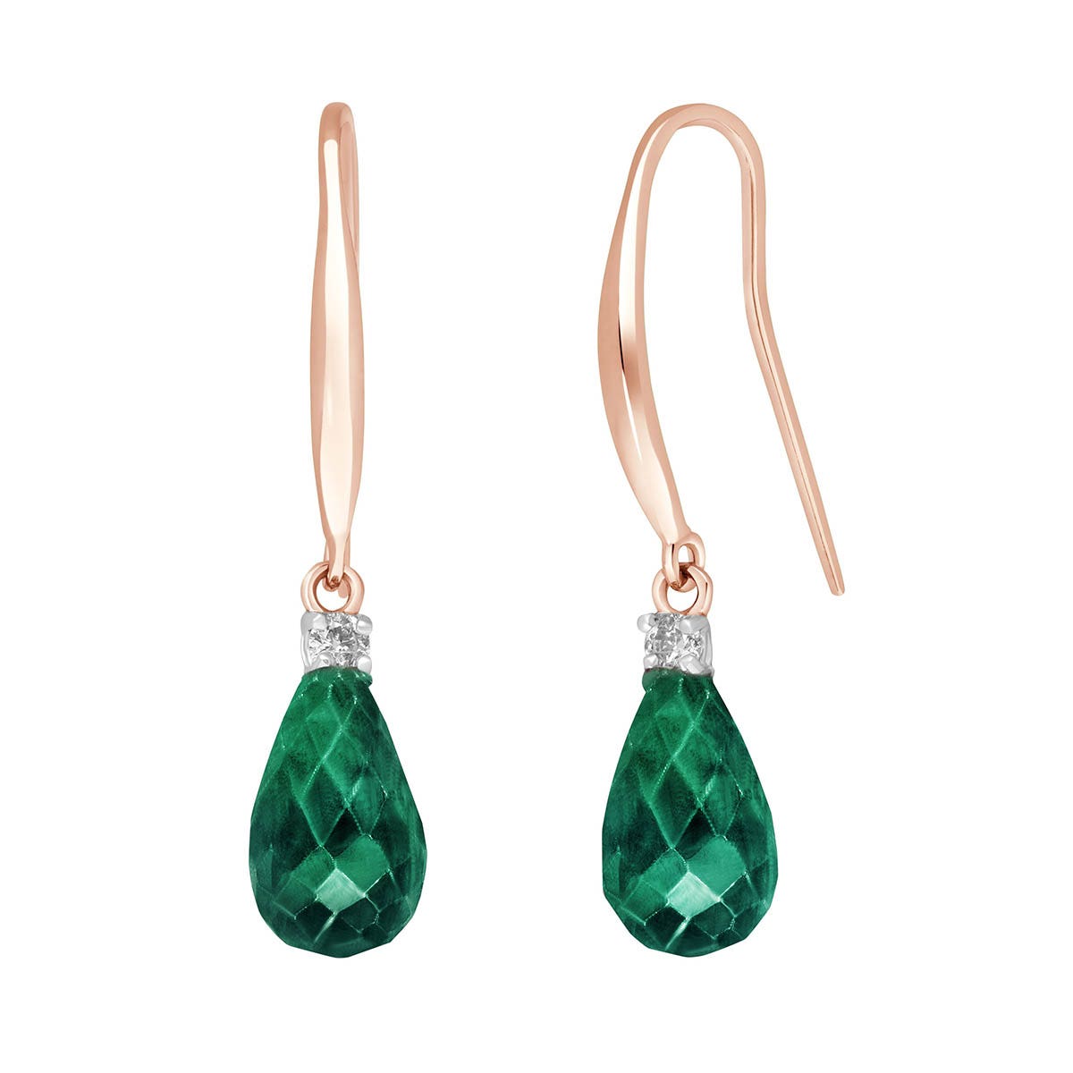 Emerald & Diamond Fish Hook Earrings handcrafted in rose gold plated 9ct gold. Two genuine emeralds, total 6.6 ct, two diamonds, total 0.1 ct for both earrings combined. Briolette cut. Size: 6.1 x 28.7 mm (0.24 x 1.13 in). Material: 9ct Rose Gold. Total metal weight: 2.4 gr. 2 briolette cut emeralds (9 x 6 mm) = 6.6 ct total for pair. 2 round cut diamonds (I colour, SI1 clarity) = 0.1 ct total for pair. Colour: Green. Stone cut: Briolette Cut. Anniversary: 20th Anniversary, 35th Anniversary. Birthstone: May.