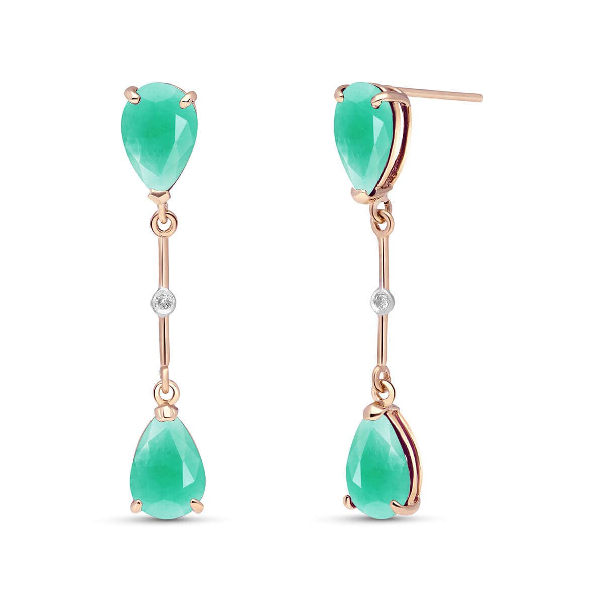 Emerald & Diamond Chandelierdrop Earrings handcrafted in rose gold plated 9ct gold. Four genuine emeralds, total 15 ct, two diamonds, total 0.01 ct for both earrings combined. Pear cut. Size: 6.1 x 35.1 mm (0.24 x 1.38 in). Material: 9ct Rose Gold. Total metal weight: 2.6 gr. 4 pear cut emeralds (9 x 6 mm) = 15 ct total for pair. 2 round cut diamonds (G colour, SI2 clarity) = 0.01 ct total for pair. Colour: Green. Stone cut: Pear Cut. Anniversary: 20th Anniversary, 35th Anniversary. Birthstone: May.