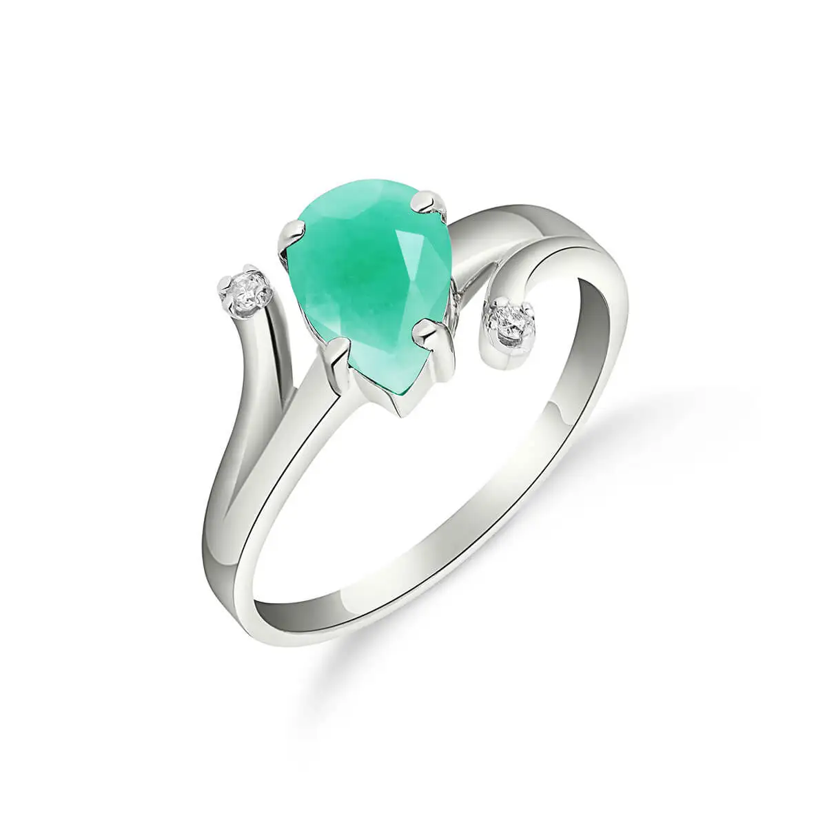 Emerald & Diamond Ring handcrafted in solid white gold. Single 1 ct genuine emerald, two diamonds, total 0.01 ct. Pear cut. Available from sizes H to Z including half sizes. Size: 10.2 mm (0.4 in). Material: 9ct White Gold. Total metal weight: 2.6 gr. 1 pear cut emerald (9 x 6 mm) = 1 ct. 2 round cut diamonds (K colour, SI2 clarity) = 0.01 ct total. Colour: Green. Stone cut: Pear Cut. Anniversary: 20th Anniversary, 35th Anniversary. Birthstone: May.