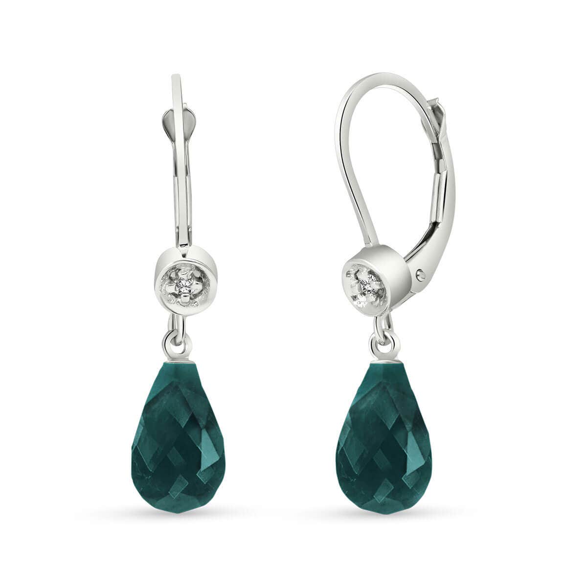 Emerald & Diamond Leverback Earrings handcrafted in solid white gold. Two genuine emeralds, total 6.6 ct, two diamonds, total 0.03 ct for both earrings combined. Briolette cut. Size: 4.1 x 27.7 mm (0.16 x 1.09 in). Material: 9ct White Gold. Total metal weight: 2.0 gr. 2 briolette cut emeralds (9 x 6 mm) = 6.6 ct total for pair. 2 round cut diamonds (K colour, SI2 clarity) = 0.03 ct total for pair. Colour: Green. Stone cut: Briolette Cut. Anniversary: 20th Anniversary, 35th Anniversary. Birthstone: May.