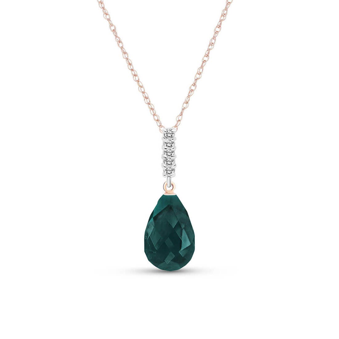 Emerald & Diamond Pendant Necklace handcrafted in rose gold plated 9ct gold. Single 8.8 ct genuine emerald, five diamonds, total 0.08 ct. Briolette cut. The pendant is suspended from a rose gold double link rope chain with spring clasp. Size: 7.9 x 24.4 mm (0.31 x 0.96 in). Material: 9ct Rose Gold. Total metal weight: 3.14 gr. 1 briolette cut emerald = 8.8 ct. 5 round cut diamonds (K colour, I3 clarity) = 0.08 ct total. Colour: Green. Stone cut: Briolette Cut. Anniversary: 20th Anniversary, 35th Anniversary. Birthstone: May.