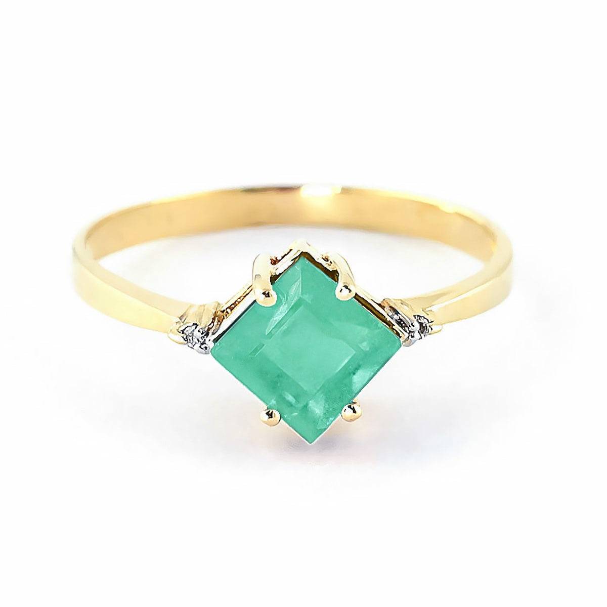 Emerald & Diamond Ring handcrafted in solid 18ct gold. Single 1.45 ct genuine emerald, two diamonds, total 0.01 ct. Square cut. Available from sizes H to Z including half sizes. Size: 8.9 mm (0.35 in). Material: 18ct Gold. Total metal weight: 2.0 gr. 1 square cut emerald (6 x 6 mm) = 1.45 ct. 2 round cut diamonds (K colour, I3 clarity) = 0.01 ct total. Colour: Green. Stone cut: Square Cut. Anniversary: 20th Anniversary, 35th Anniversary. Birthstone: May.