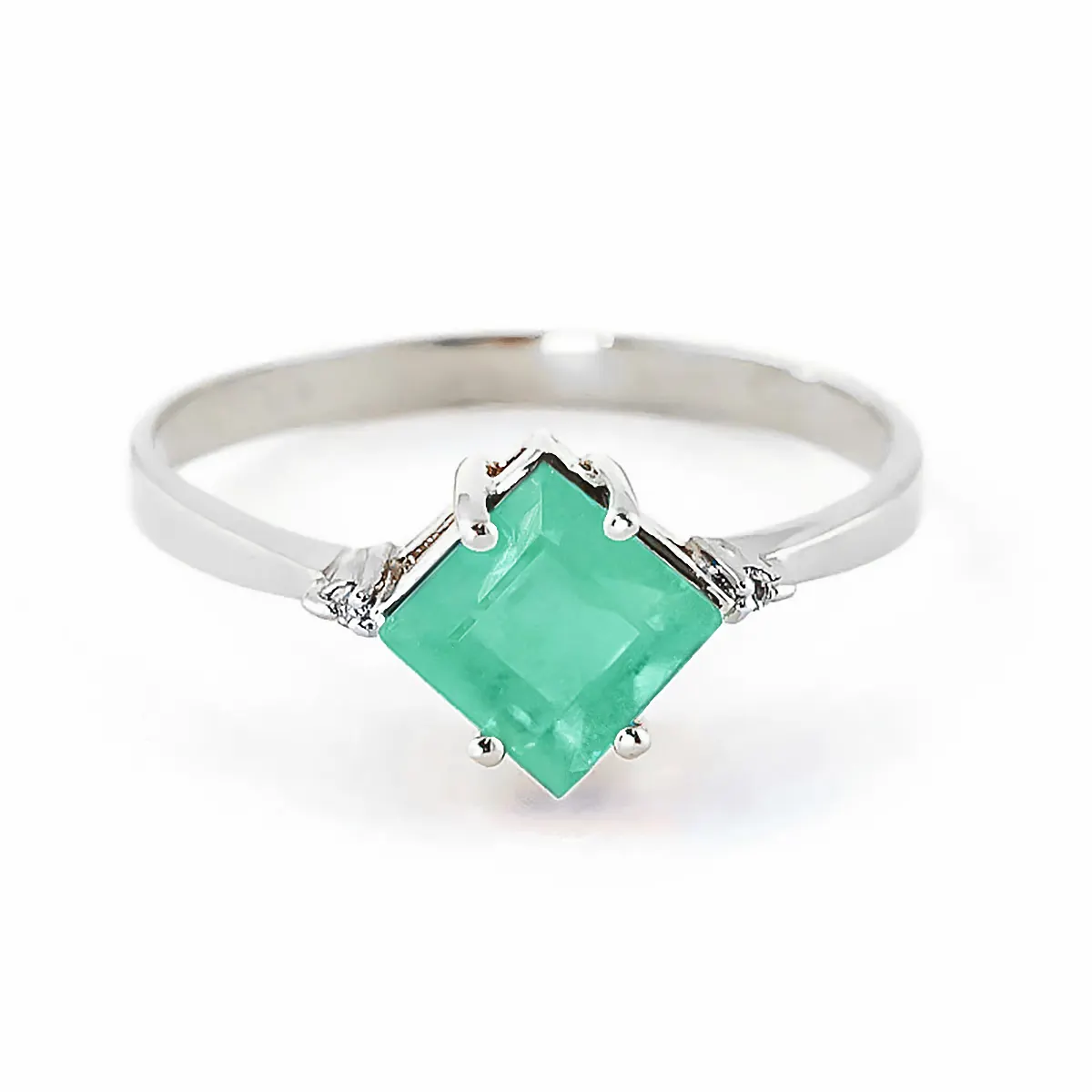 Emerald & Diamond Ring handcrafted in solid white gold. Single 1.45 ct genuine emerald, two diamonds, total 0.01 ct. Square cut. Available from sizes H to Z including half sizes. Size: 8.9 mm (0.35 in). Material: 9ct White Gold. Total metal weight: 1.4 gr. 1 square cut emerald (6 x 6 mm) = 1.45 ct. 2 round cut diamonds (K colour, I3 clarity) = 0.01 ct total. Colour: Green. Stone cut: Square Cut. Anniversary: 20th Anniversary, 35th Anniversary. Birthstone: May.