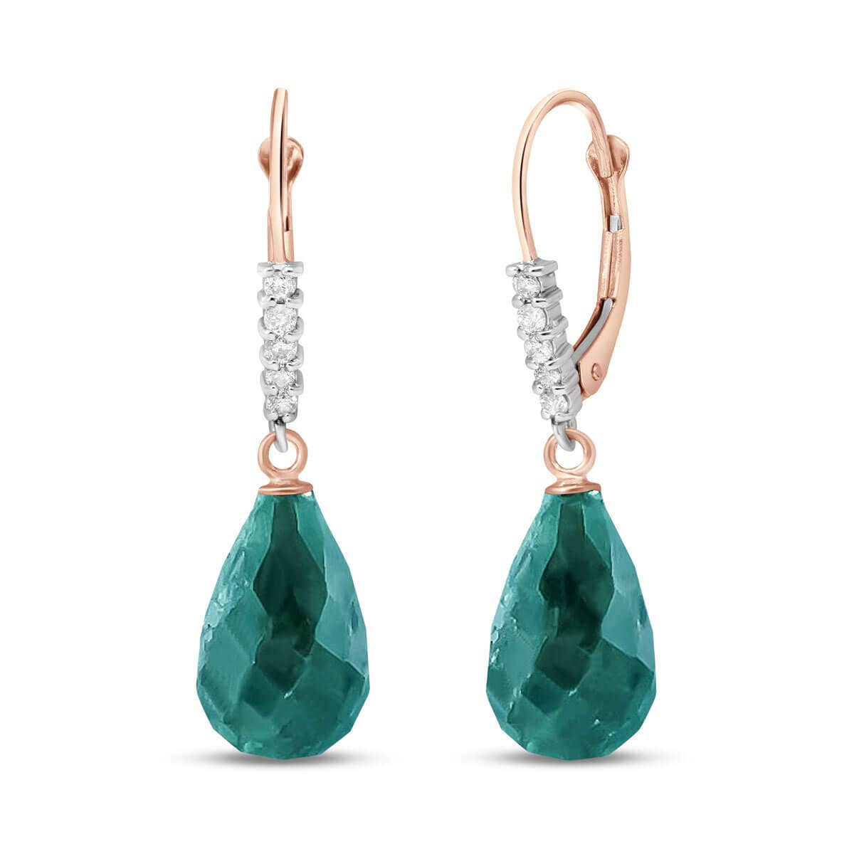 Emerald & Diamond Leverback Earrings handcrafted in rose gold plated 9ct gold. Two genuine emeralds, total 8.8 ct, ten diamonds, total 0.15 ct for both earrings combined. Briolette cut. Size: 8.4 x 30.2 mm (0.33 x 1.19 in). Material: 9ct Rose Gold. Total metal weight: 3.7 gr. 2 briolette cut emeralds (12 x 8 mm) = 8.8 ct total for pair. 10 round cut diamonds (K colour, SI1 clarity) = 0.15 ct total for pair. Colour: Green. Stone cut: Briolette Cut. Anniversary: 20th Anniversary, 35th Anniversary. Birthstone: May.