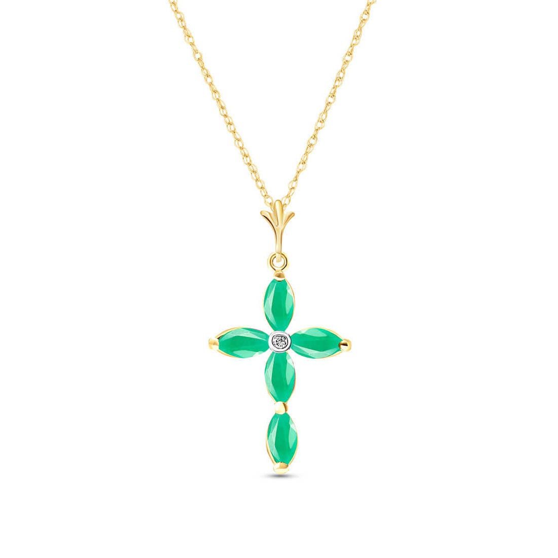 Emerald & Diamond Pendant Necklace handcrafted in solid gold. Five genuine emeralds, total 1.5 ct, single 0.15 ct diamond. Marquise cut. The pendant hangs from a gold double link rope chain with spring clasp. Size: 15.2 x 28.7 mm (0.6 x 1.13 in). Material: 9ct Gold. Total metal weight: 1.94 gr. 5 marquise cut emeralds (6 x 3 mm) = 1.5 ct total. 1 round brilliant cut diamond (K colour, SI1 clarity) = 0.15 ct. Colour: Green. Stone cut: Marquise Cut. Anniversary: 20th Anniversary, 35th Anniversary. Birthstone: May.