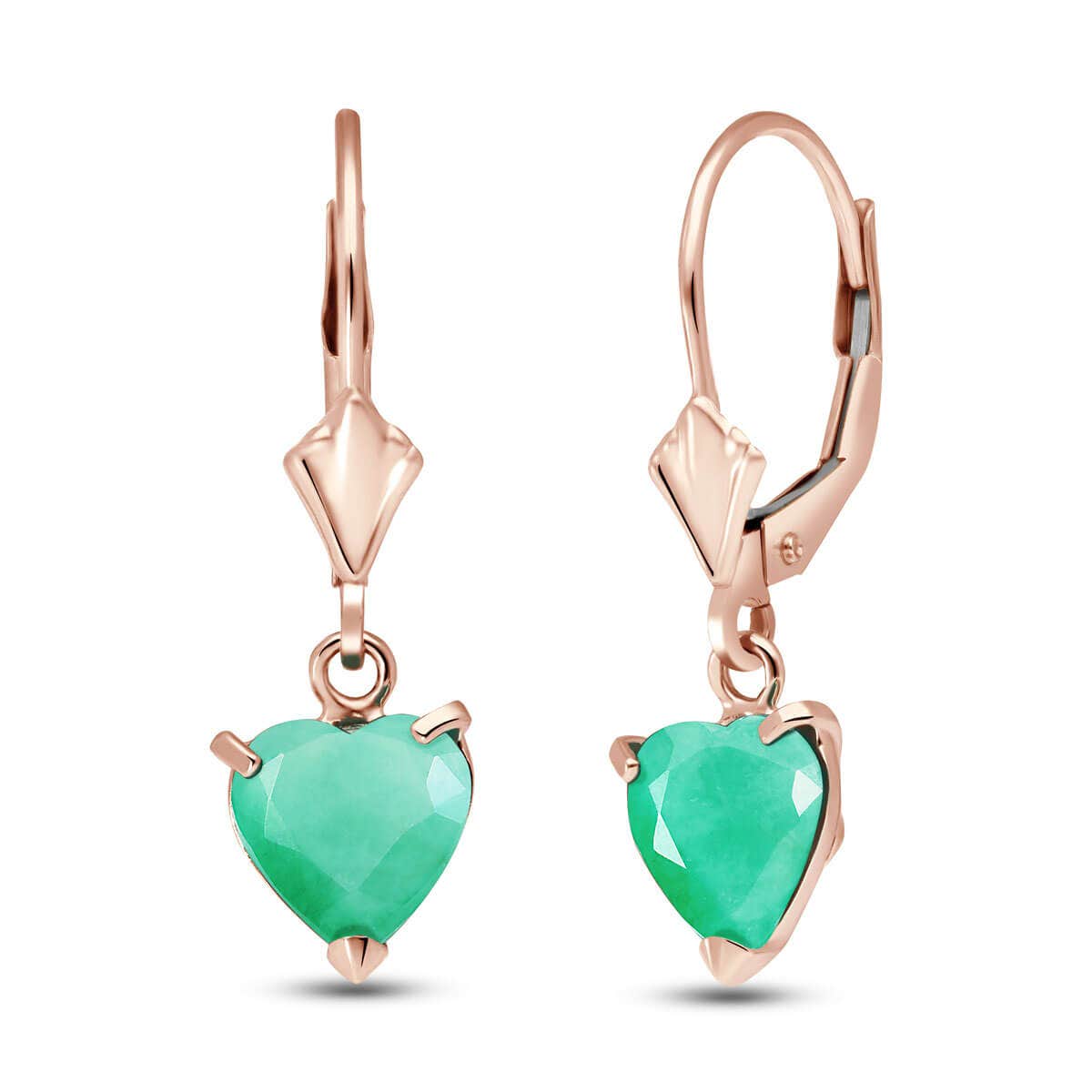 Emerald Leverback Earrings handcrafted in rose gold plated 9ct gold. Two genuine emeralds, total 2.4 ct for both earrings combined. Heart shaped. Size: 7.1 x 25.1 mm (0.28 x 0.99 in). Material: 9ct Rose Gold. Total metal weight: 1.7 gr. 2 heart shaped emeralds (7 x 7 mm) = 2.4 ct total for pair. Colour: Green. Stone cut: Heart Shaped. Anniversary: 20th Anniversary, 35th Anniversary. Birthstone: May.